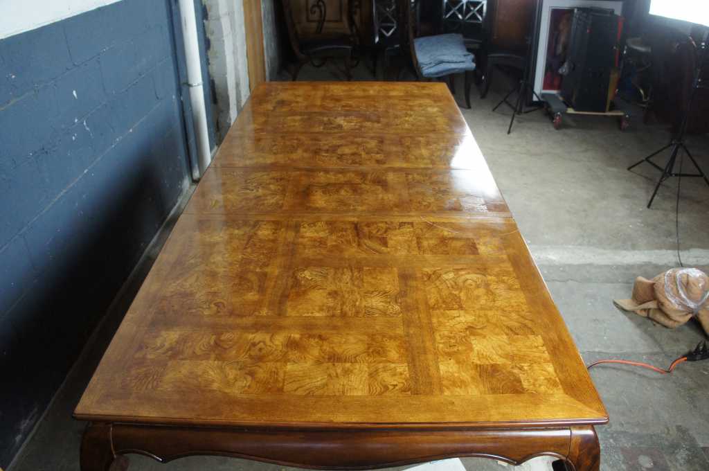 Universal Furniture Ming style dining table. Finished in Mahogany with a burled ash top. Reminiscent of Century Furniture's Chin Hua Collection. Includes 2 original leafs and a wooden panel that was made to allow for larger settings.