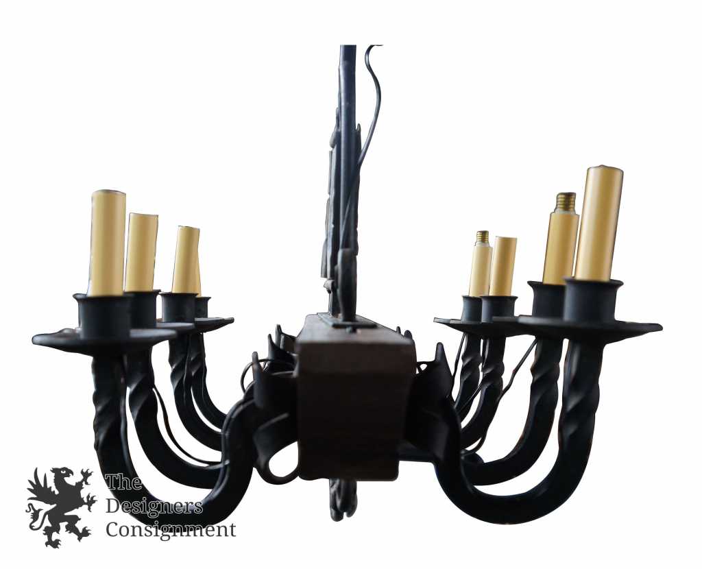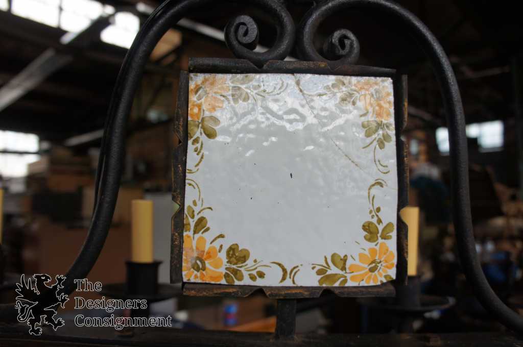 Intriguing handcrafted Spanish revival chandelier, circa 1940s. The central wooden beam is beautifully shaped and mounted with forged iron arms leading to lights with candle covers. The chandelier is held by a scrolled iron support with a hand-painted delft boat tile above. The perfect compliment to any rustic setting.