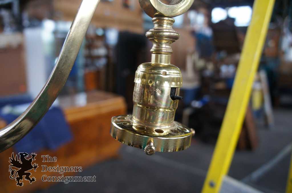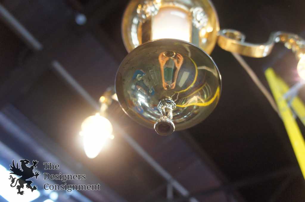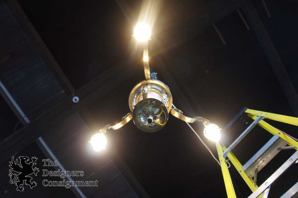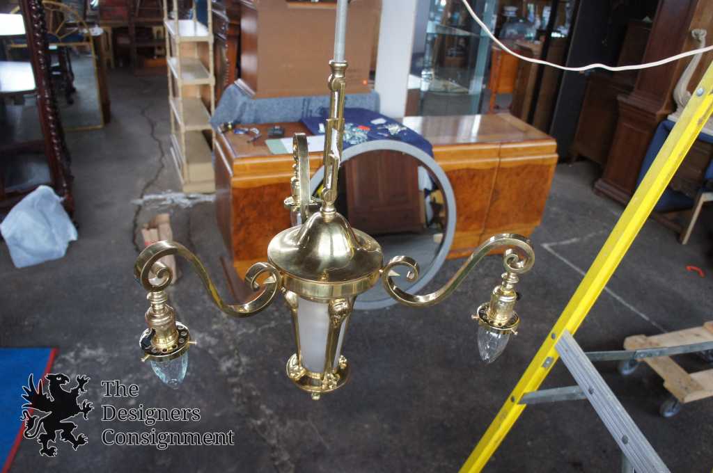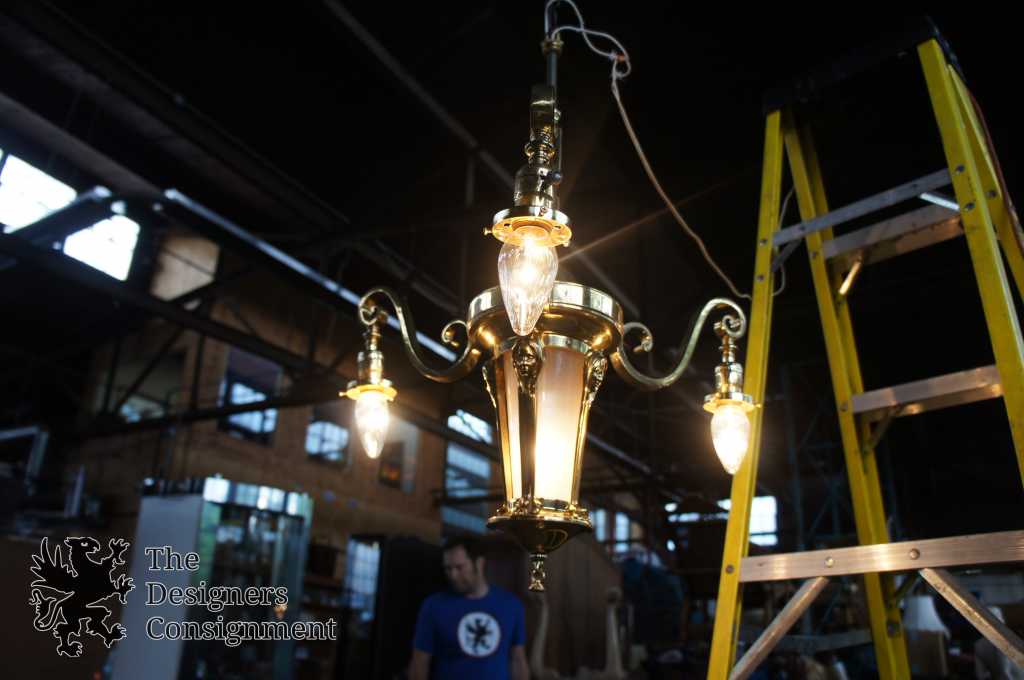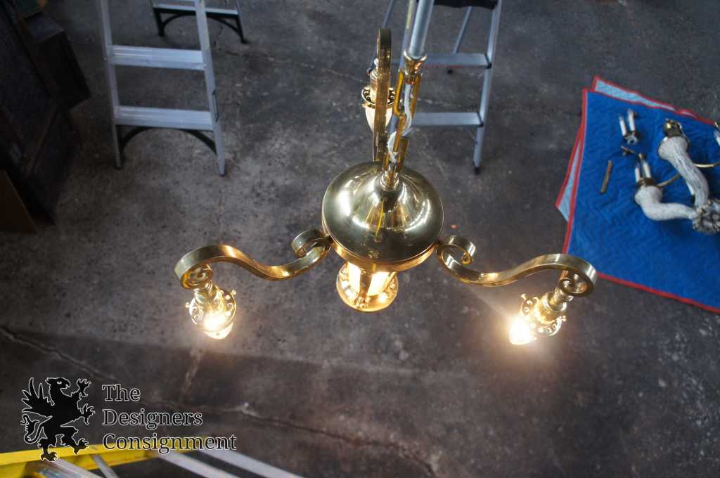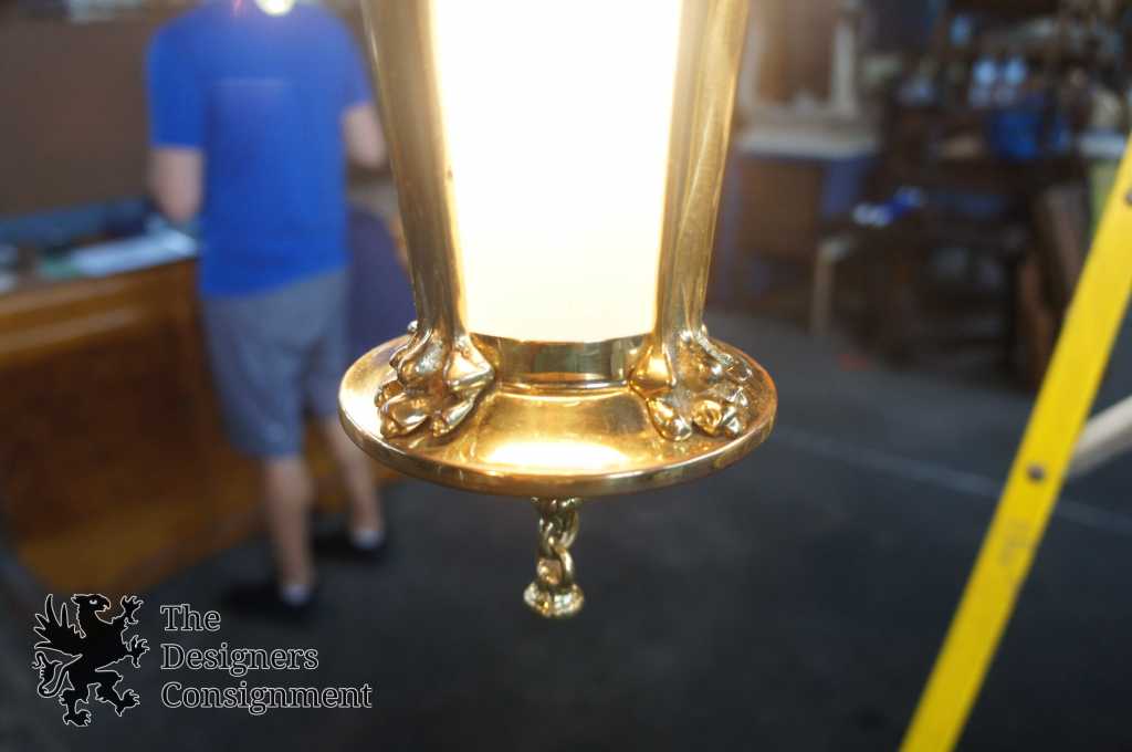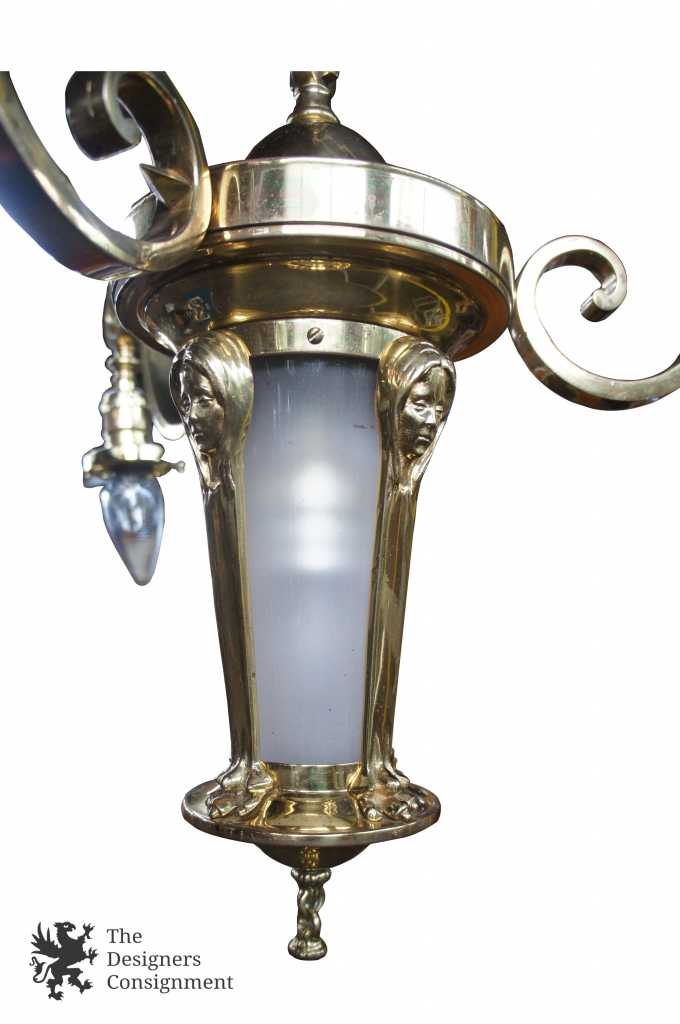 Egyptian Revival three arm chandelier with illuminated center. At the center is a tapered glass cover placed inside of intricately designed sphinx figures. Each outer light can be illuminated via switch. Globes or torchieres can be added.
