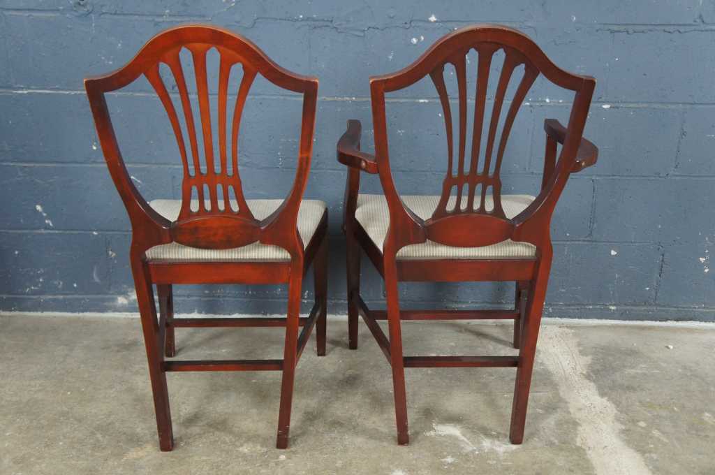 A lovely set of Hepplewhite style dining chairs. Made from Mahogany towards the middle of the century. Featured a pierced shield back and striped upholstery A nice compliment to any dining setting
