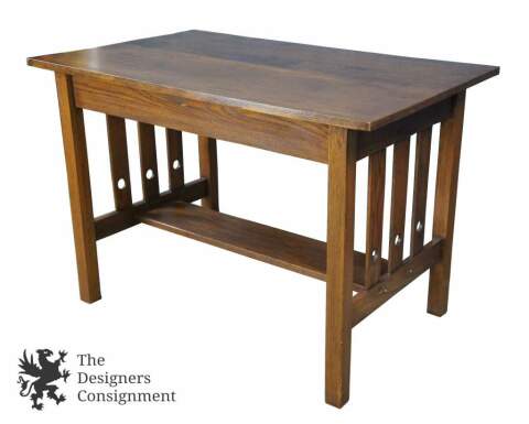 A beautiful mission style oak library table. Features 3 pierces slats along the side and a trestle base.