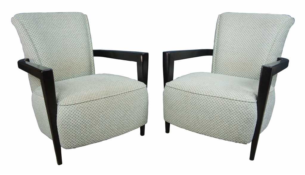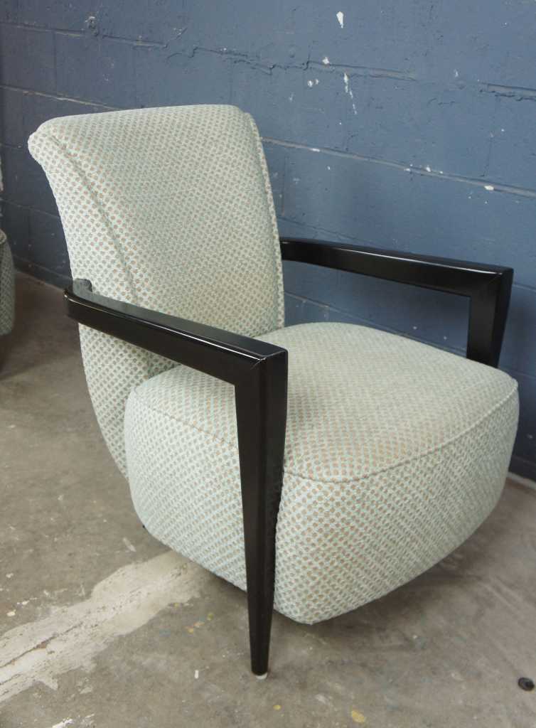 2 elegant modern arm chairs by Rosello of Paris, France. An upholstered slipper chair with black arms and turquoise spotted beige upholstery. Circa 1960s. A nice touch of color for any setting.