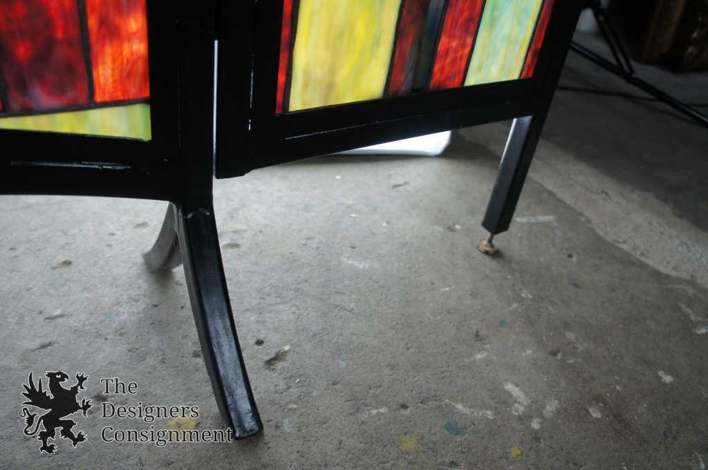 Mission style folding screen. Features a footed metal with beautiful green and red stained glass panels. The outer sections can be removed to work with a smaller area.