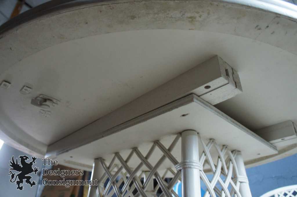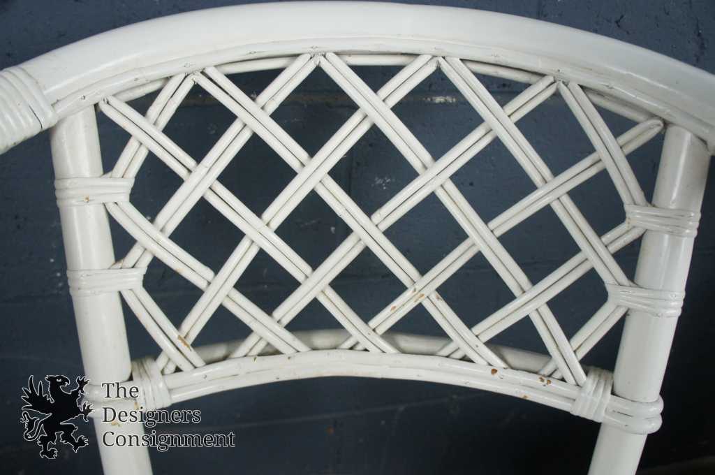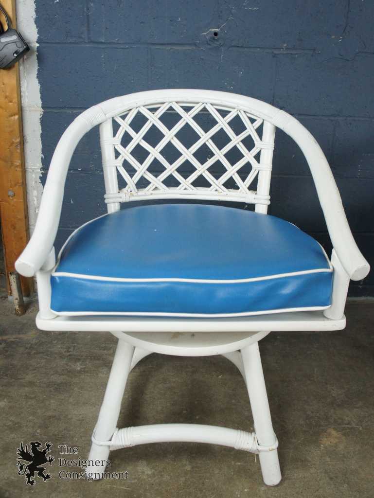 4 Barrel Back 180 Degree Swivel & Return Armchairs With Rattan Backs. A Round Laminate Topped Table with Bamboo and Rattan Base. Original finish has been painted white.