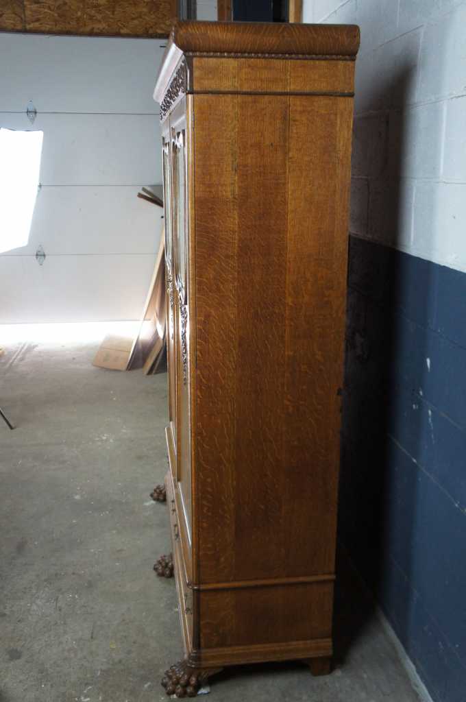 An exquisite circa 1900 Victorian wardrobe or linen closet. Empire inspired with large paw feet and a curved molding along the top. Features two beautifully carved and mirrored doors over large lower drawers. Made from Quartersawn oak with a magnificent wood grain. Opens to four shelves that can be removed in lieu of a hanging bar.