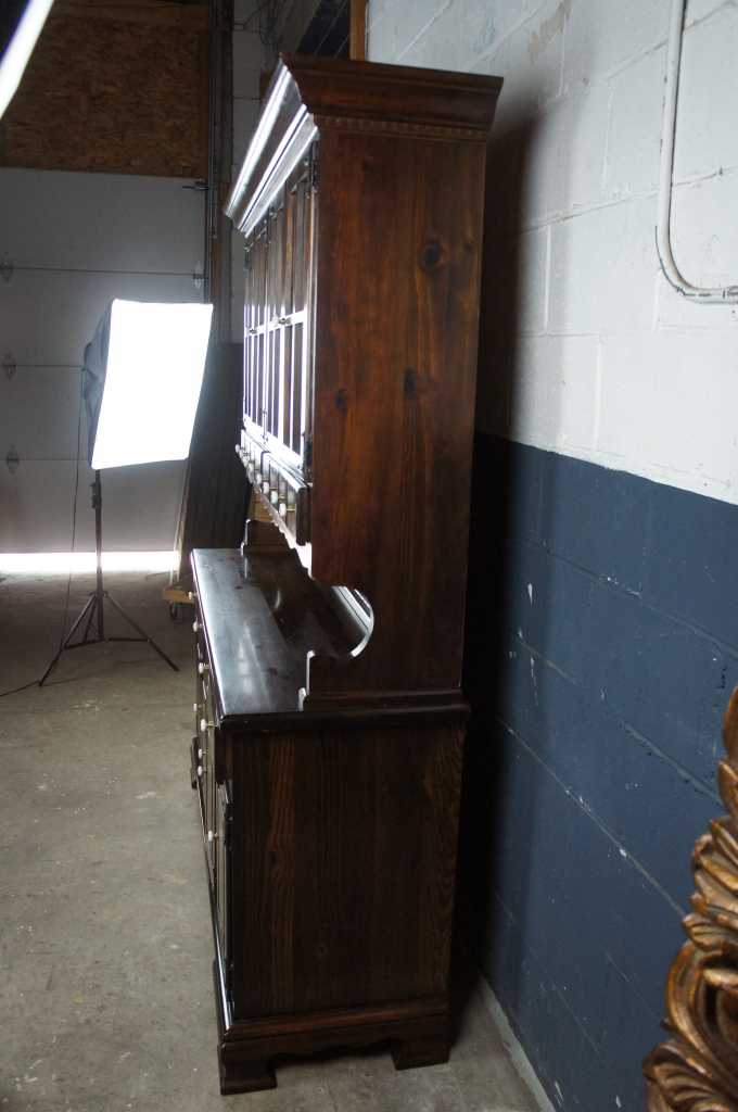 A lovely Early American style step-back China Hutch. Perfect for serving and display. Made from pine with a dark finish and porcelain knobs. Includes 8 drawers for storage, plate grooves and upper and lower shelves. Circa 1970s.