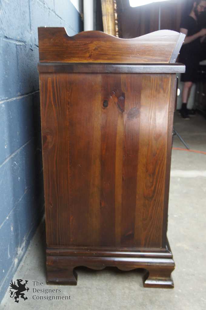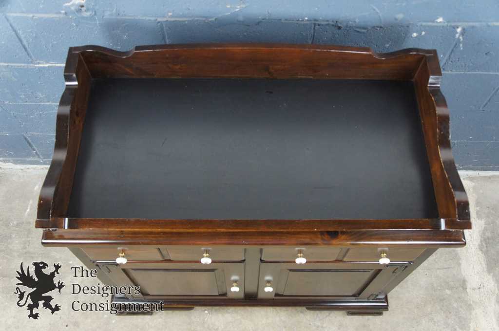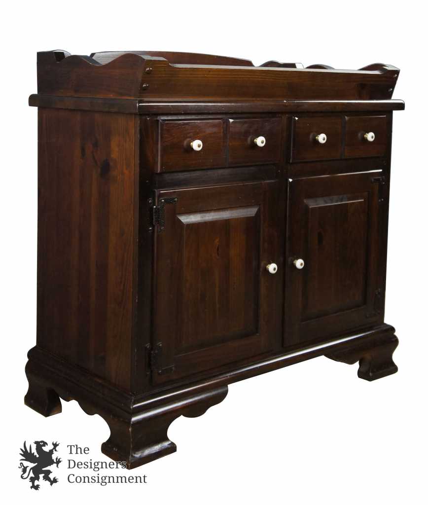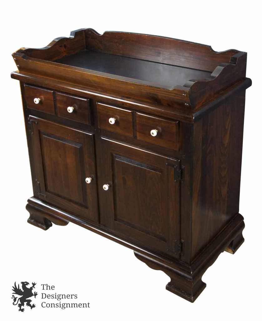 A lovely Early American style dry sink. Perfect for use as a dry bar or changing table. Made from pine with porcelain knobs. Top surface has a durable laminate top. Circa 1970s.
