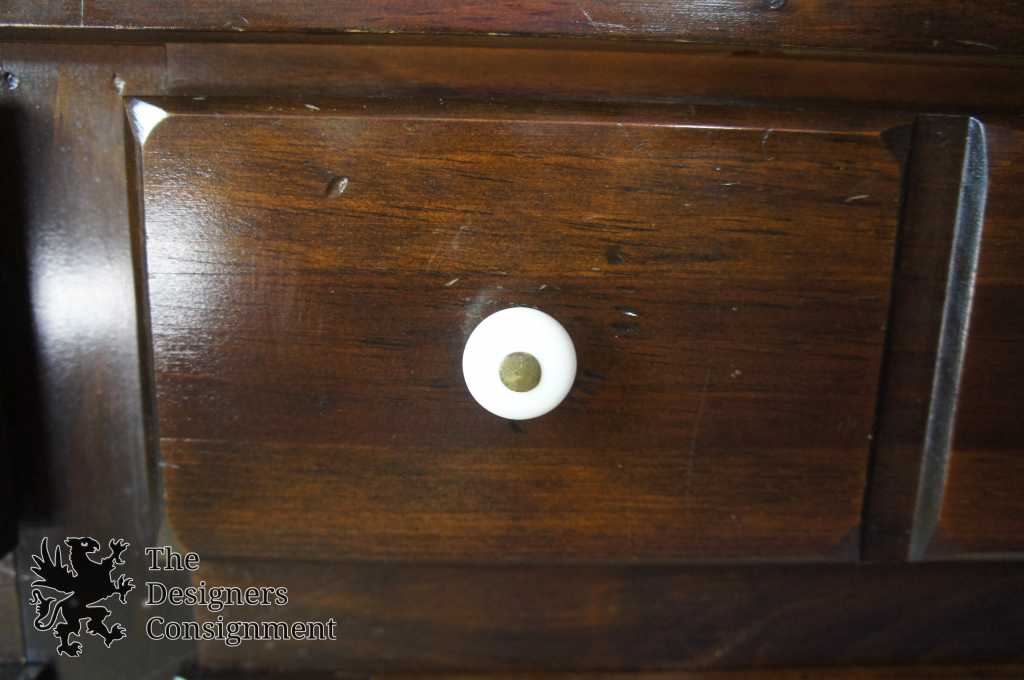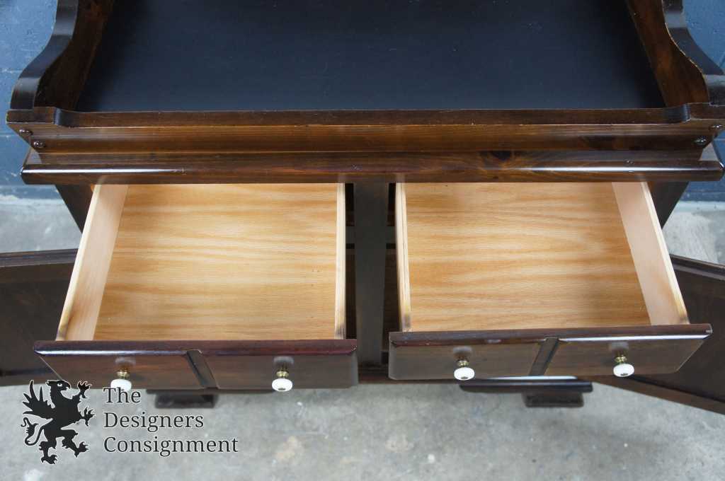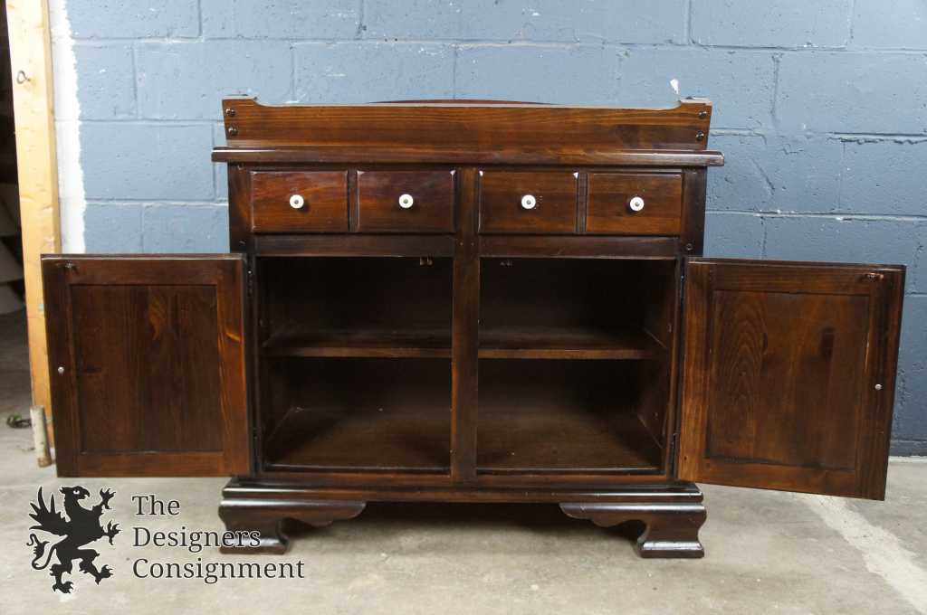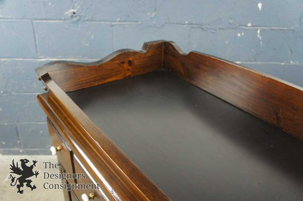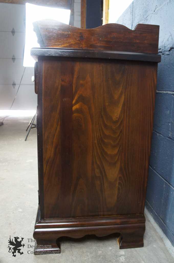 A lovely Early American style dry sink. Perfect for use as a dry bar or changing table. Made from pine with porcelain knobs. Top surface has a durable laminate top. Circa 1970s.