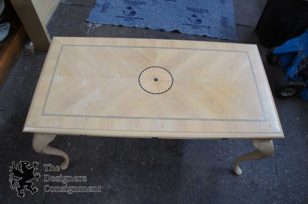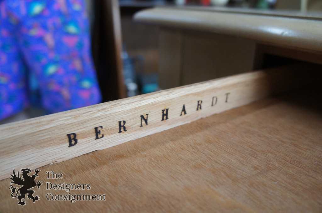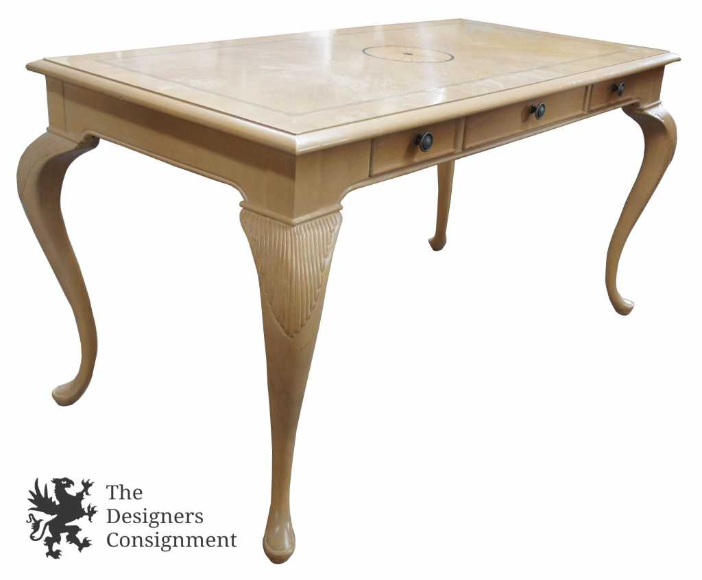 Bernhardt Neoclassical inspired office desk or library table. Beautifully designed in a light beige pickled oak with cabriole legs and a medallion along the top.