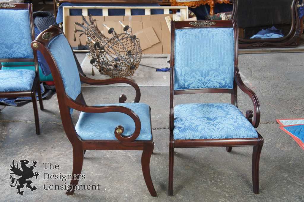 Solid Mahogany scroll back chairs with brass trim, blue upholstered seat and back