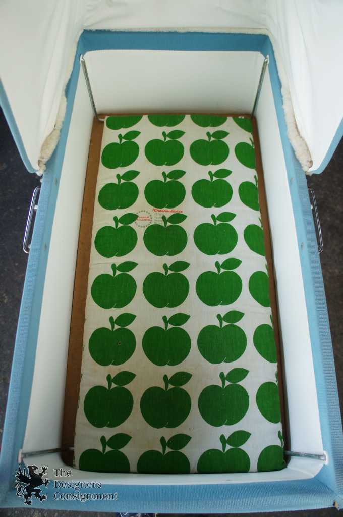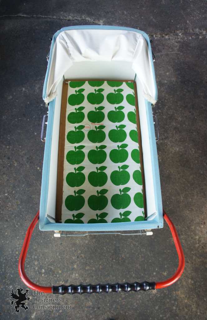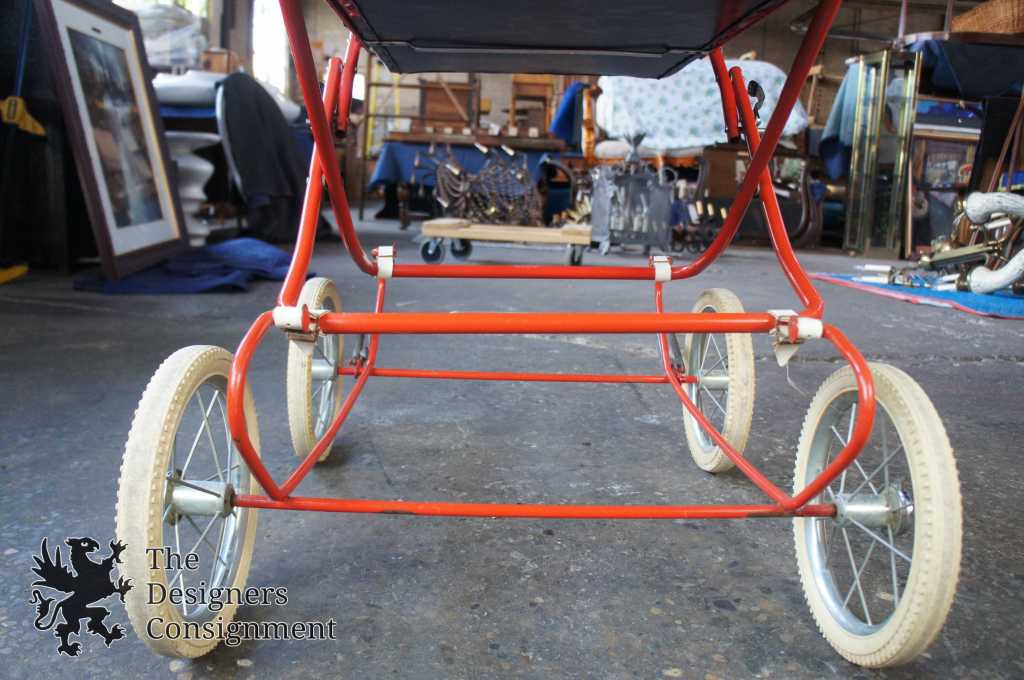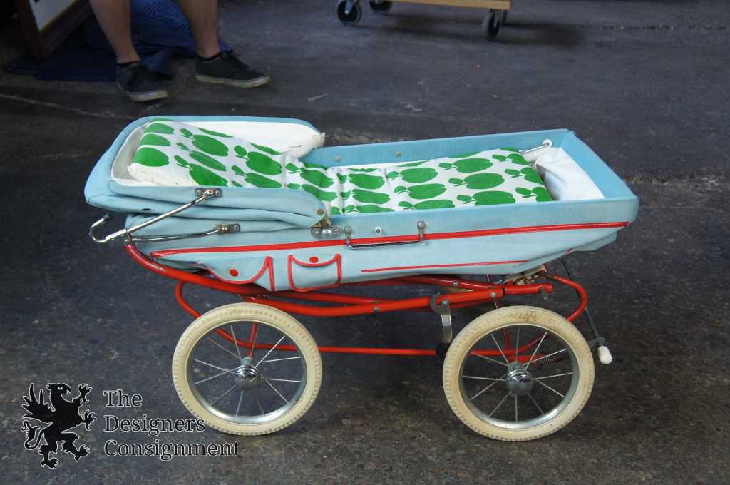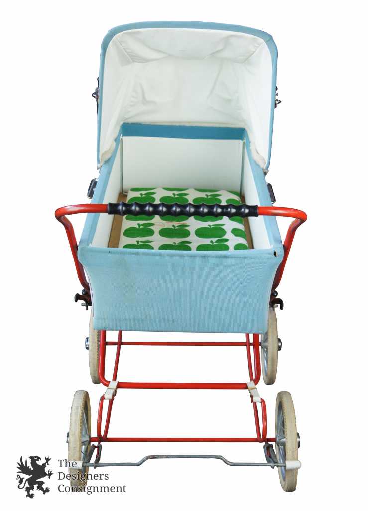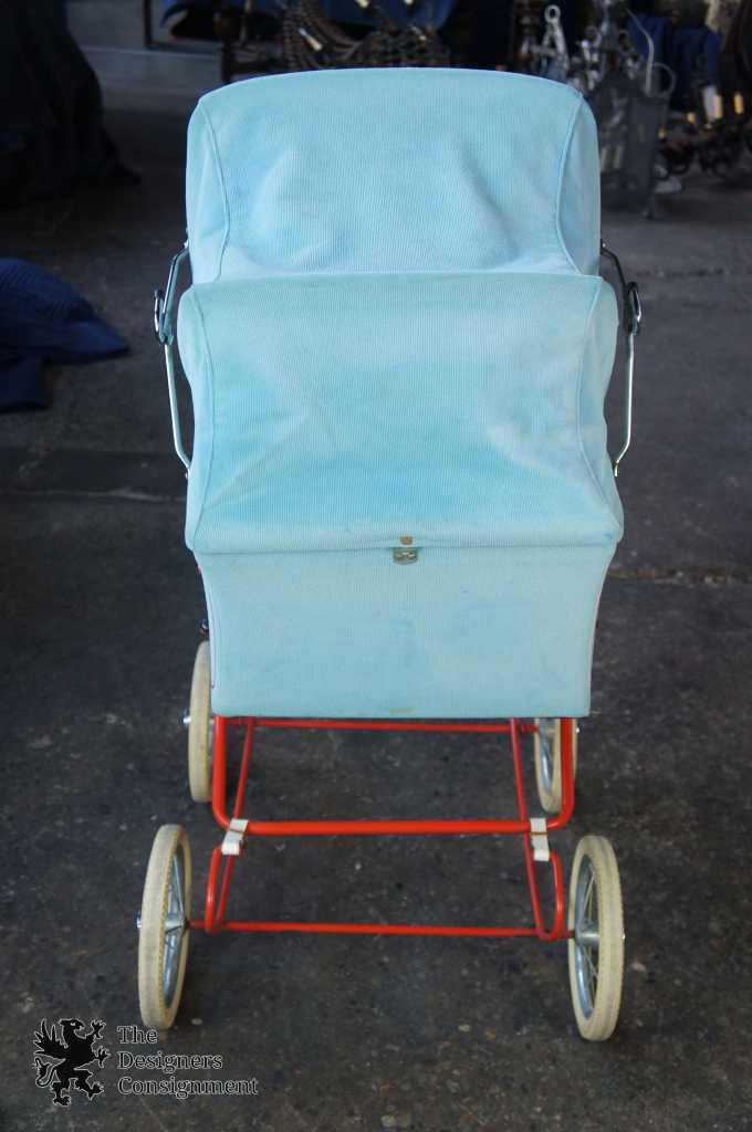 Up for consideration is a beautiful corduroy blue & red baby stroller. A cute design with large rubber wheels, brakes and a leather strap system for shocks. The carriage and base easily fold up allowing it to fit into a car. Includes a Zollner Kindermatrratze.
