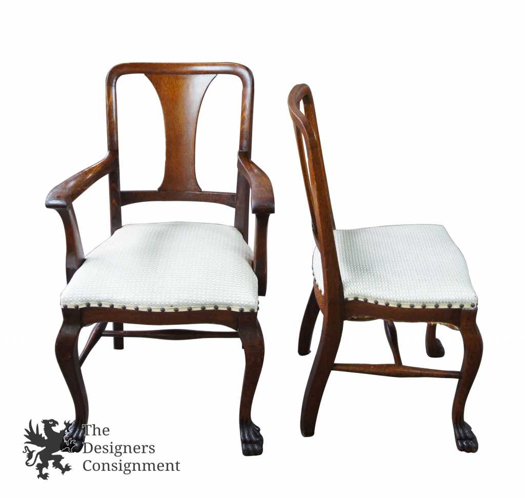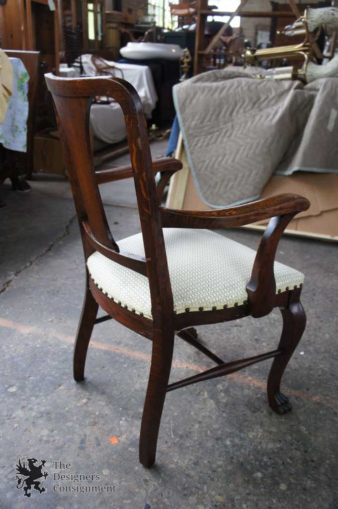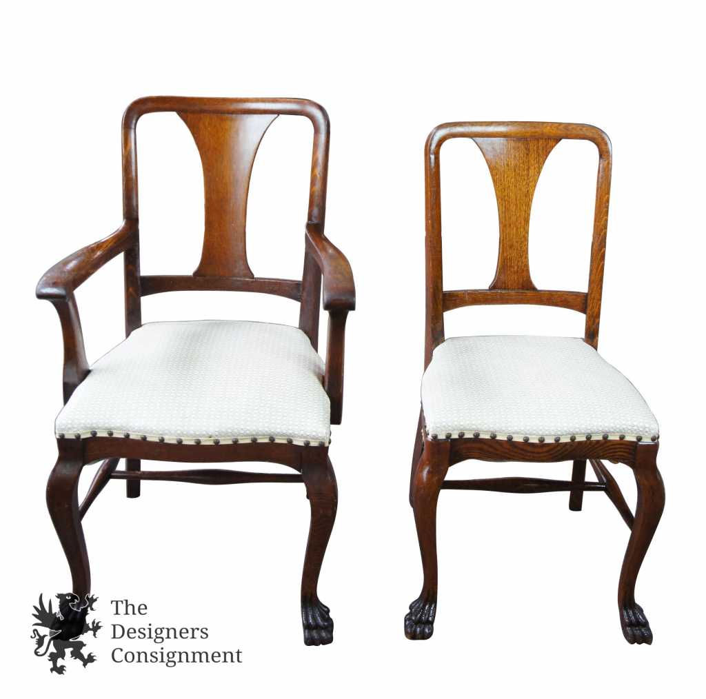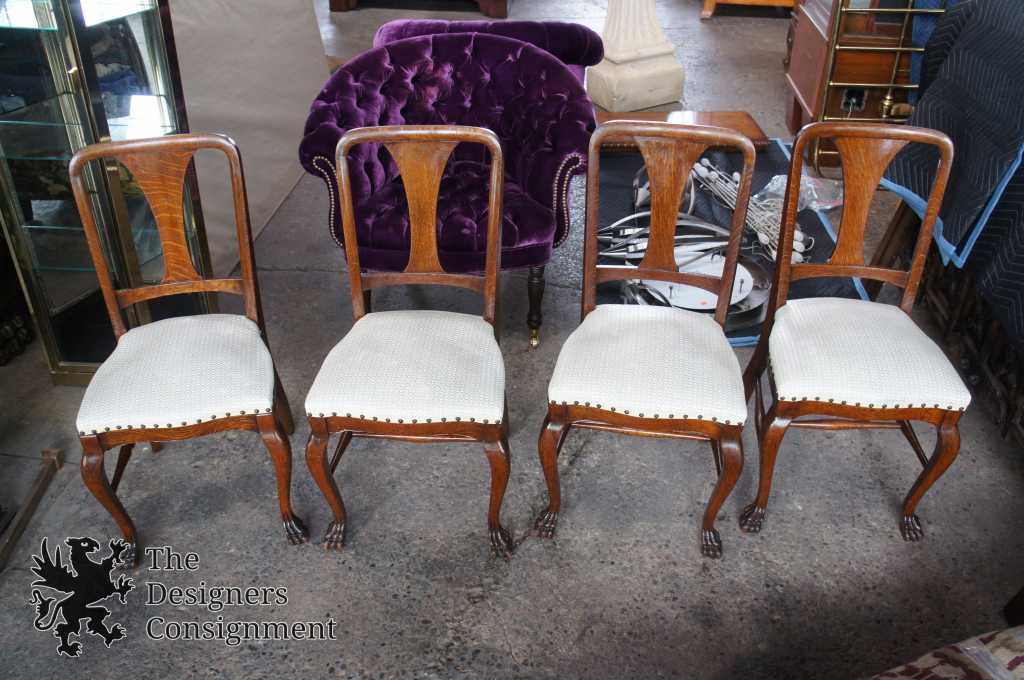 A gorgeous set of six turn of the century solid quarter sawn oak dining chairs. Beautifully designed with curved shoulders, shaped splats and cabriole legs leading to lion paw feet. Covered in a white upholstery with brass nialhead trim. Includes 5 side chairs and one captains chair.