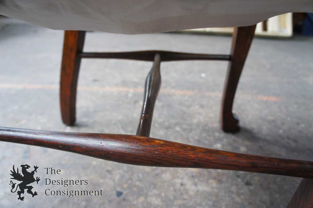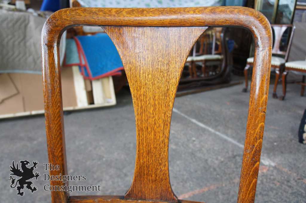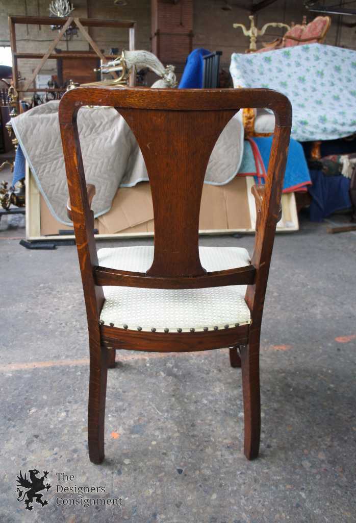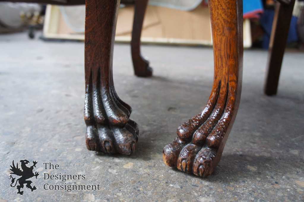 A gorgeous set of six turn of the century solid quarter sawn oak dining chairs. Beautifully designed with curved shoulders, shaped splats and cabriole legs leading to lion paw feet. Covered in a white upholstery with brass nialhead trim. Includes 5 side chairs and one captains chair.