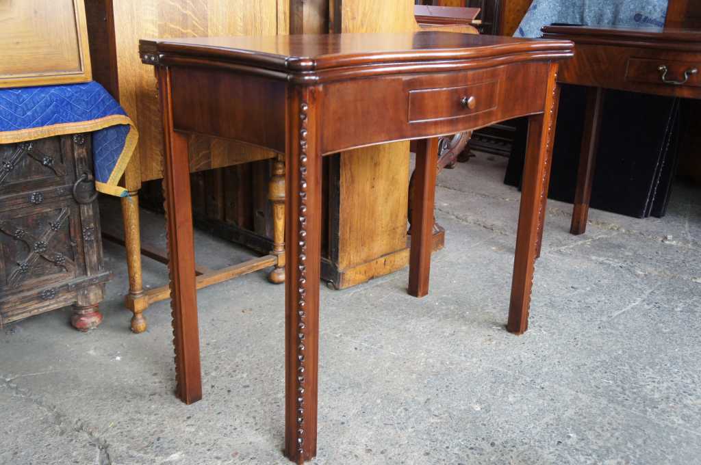 A gorgeous pair of Edwardian era game tables. Perfect for an entryway or hall area. Serpentine with mahogany finish and carved legs. The tables flip open and are supported by a gate-leg that swings out from the rear.