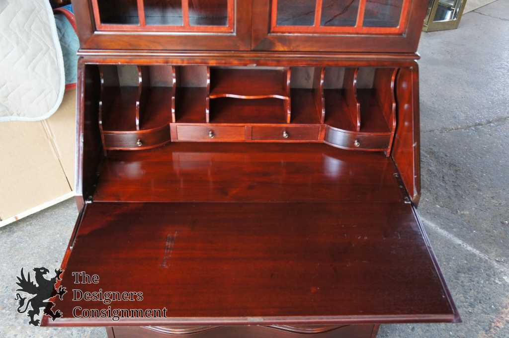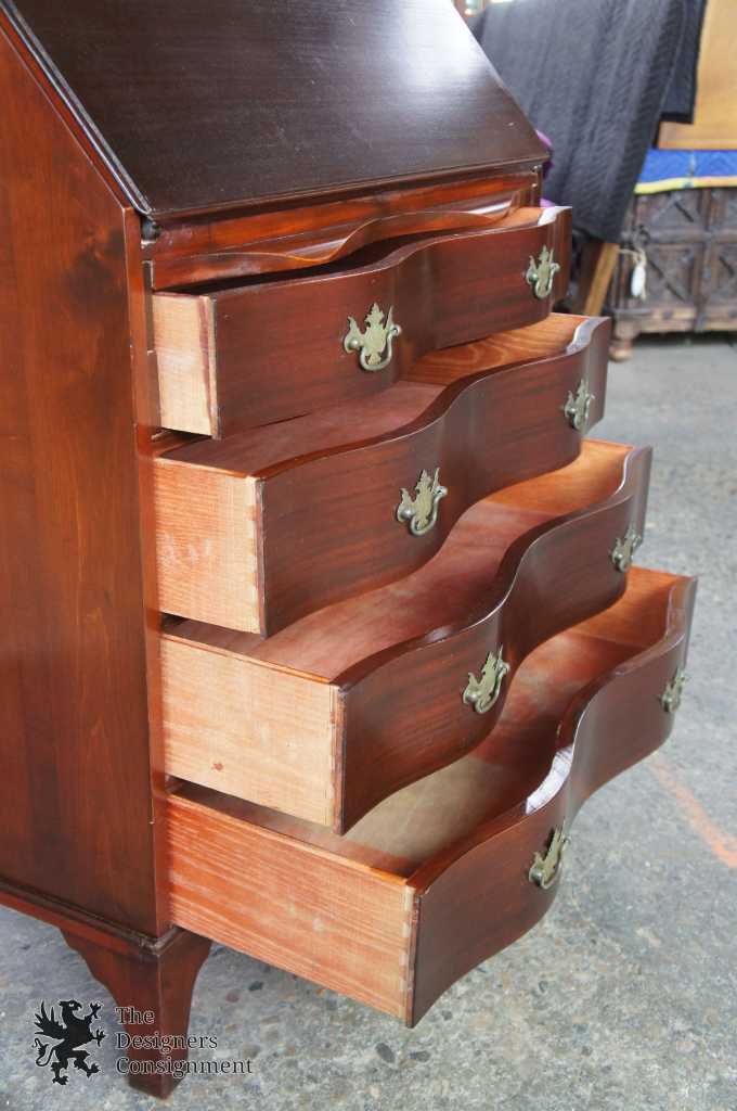A gorgeous serpentine front one piece secretary desk. Made from American walnut. Interior opens to four drawers and pigeon holes. Upper bookcase portion shows an open pediment with (removable) turned finial. Doors are glass with fretwork. There are 2 interior bookcase shelves. Hardware is made of brass in classic Chippendale fashion.