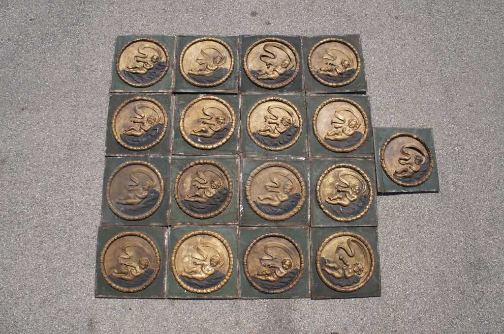 Up for consideration is a remarkable reclaimed early 20th century handmade ceiling. A reproduction made from the ceiling in the "Mantegna Chapel" of the Ca d'Oro Palace in Venice. Donated to the Dayton Art Institute in 1929. These beautiful tiles are made in a high relief polychrome design from wood with paint, gold leaf and gesso. 97 Tiles in total.