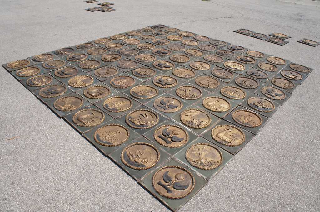 The original ceiling came from a 15th century building in Ferrara, Italy. It is placed in a small chapel of the Ca d'Oro Palace amongst a painting of St. Sebastian by Andrea Mantegna. The room is in early renaissance fashion with elegant stone walls, tiled floors and this beautiful ceiling in an elaborate medallion motif. 25 tiles make up the original ceiling.