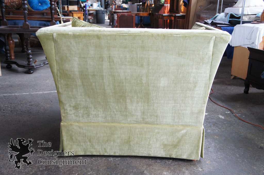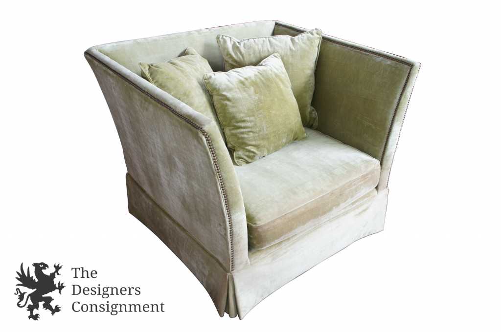 Olive green square club chair. With flared arms, matching pillows and nailhead trim its the perfect statement for any setting.