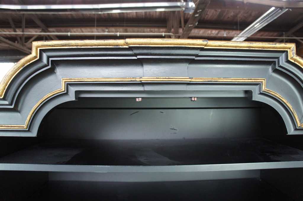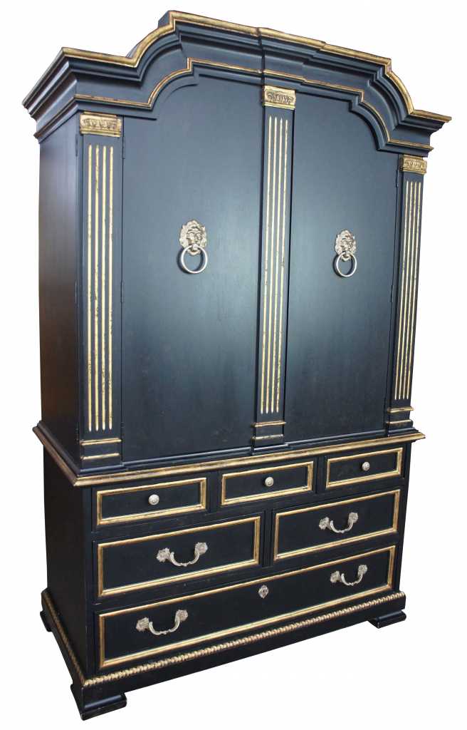 An absolute stunning cabinet by Century Furniture. With a black and gold French Empire inspired design, it sure to grab anyones attention. Suitable for a variety of uses. Includes 3 removable shelves along the top and double hinged doors allowing it to be used for media such as; television or other electronics. The base includes six drawers with a silver cloth lining along the top allowing for use as a china buffet. Features fluted columns, metal hardware and lion head knockers.
