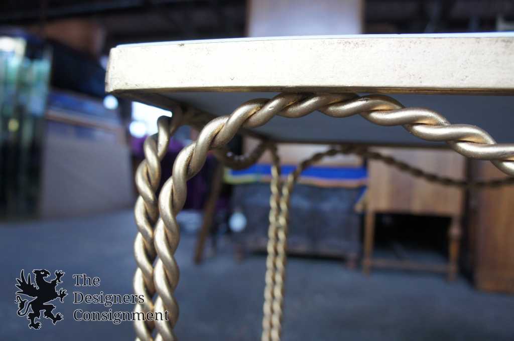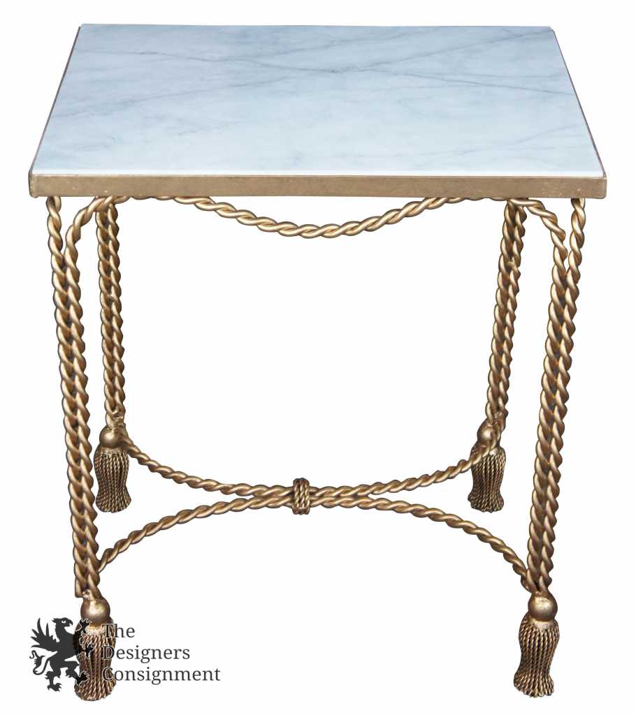 The seductive silhouette of this side table's twisted iron base and tassel feet catch the eye and command attention. The hand-painted antiqued gold finish of the base serves as a luxe complement to its white-grained marble top.