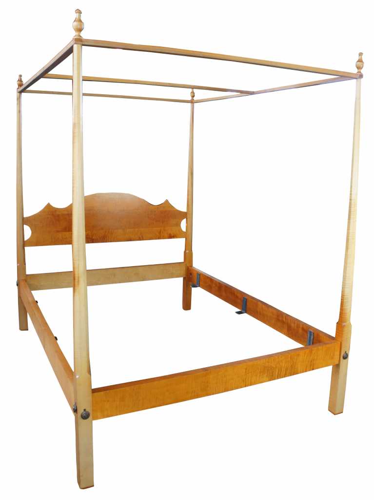 A gorgeous shaker style pencil poster bed. Includes canopy and finials. Made from solid curly maple with a stunning wood grain.