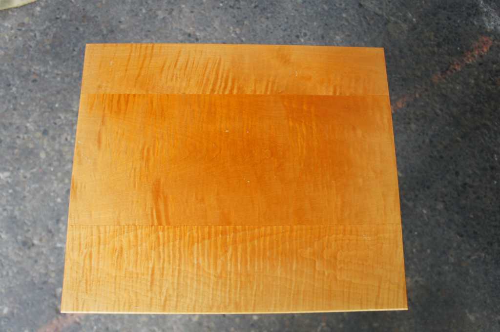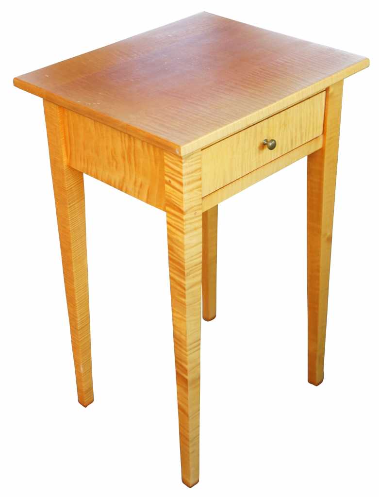 A gorgeous shaker style side table. Sold curly maple with a vivid wood grain. Features tapered legs and a drawer.