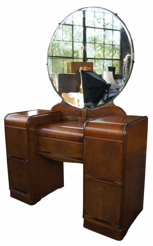 Palace Furniture Co. Dressing Table. Made from walnut with a gorgeous waterfall front leading to matchbook veneered drawers. Includes Matching vanity bench. Palace Furniture operated out of Clarksburg, Viriginia. Specializing in high end caseloads. A gorgeous piece that will add warmth to any room.