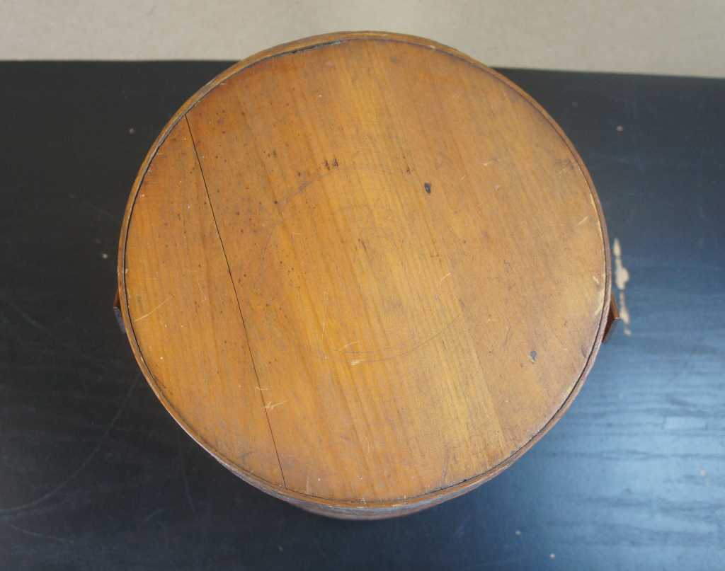 Large 19th century 12" pine firkin with swing handle. Firkins are casks that were formerly used for liquids, butter or fish. Marked 7-2-32 Fall