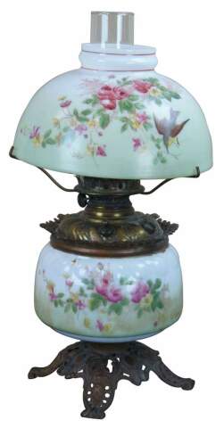 Antique Converted Electric Oil Lamp Parlor Lantern Floral Bird Gone w the Wind
