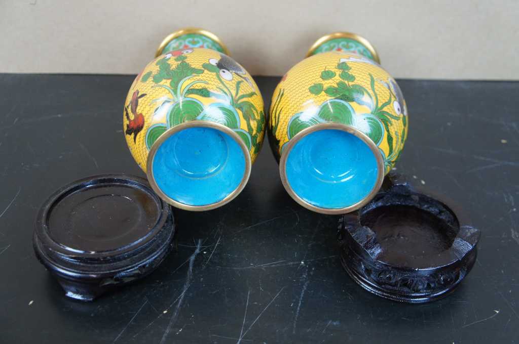 Vibrant pair of yellow cloisonne vases on mahogany carved stands; featuring Gold fish; a true mirrored pair.