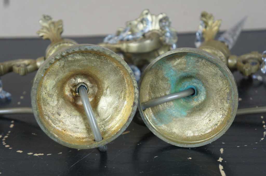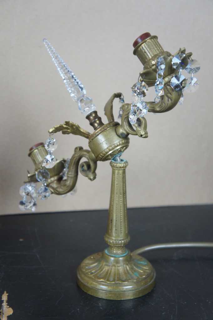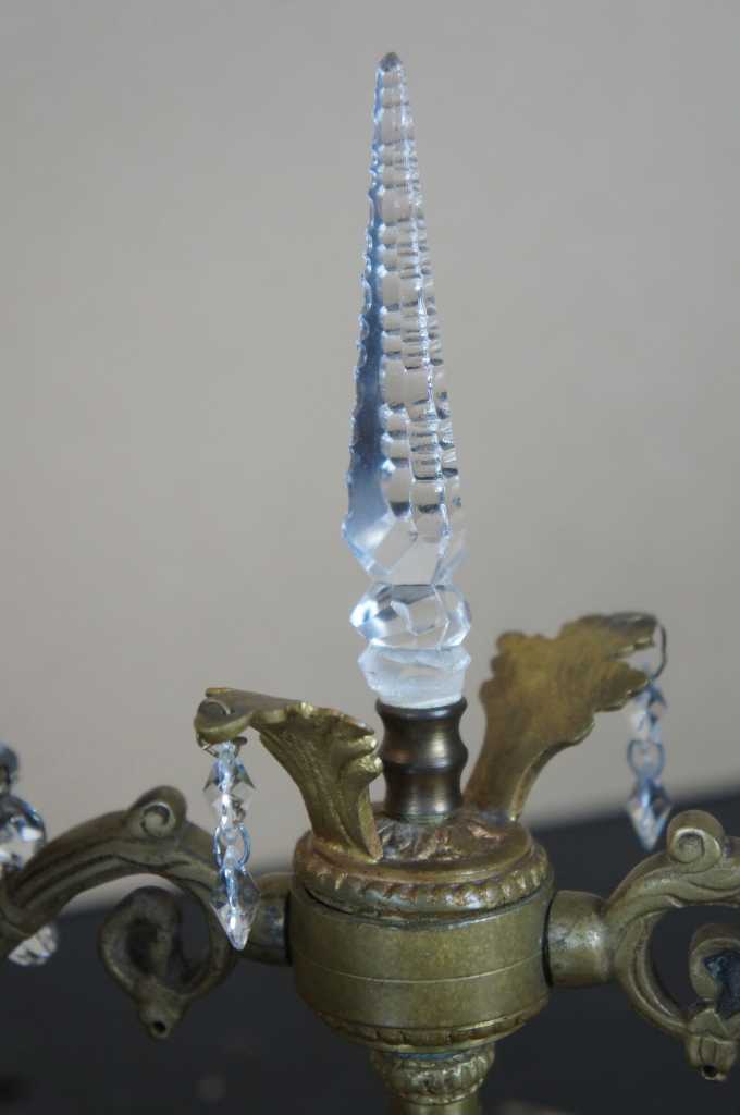 A lovely pair of early 20th century brass converted candelabras. Made from brass with French design featuring scrolled arms and central crystal cut spear finial flanked by floral accents. Additional octagonal drop crystals accent the arms and center. This lamp comes to us from Germany and with European wiring.