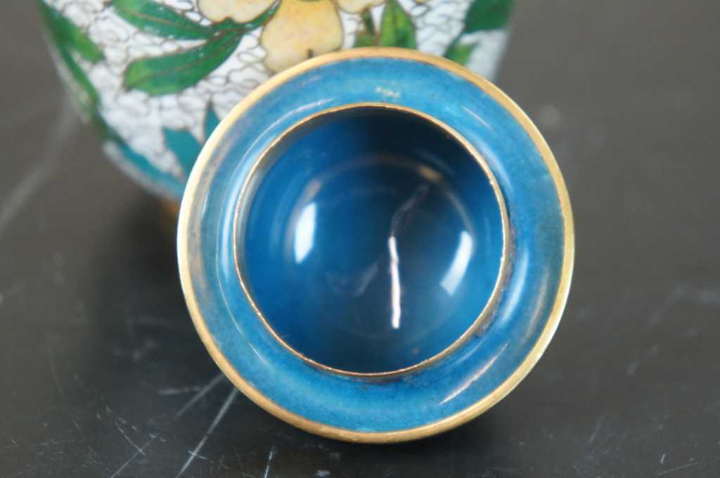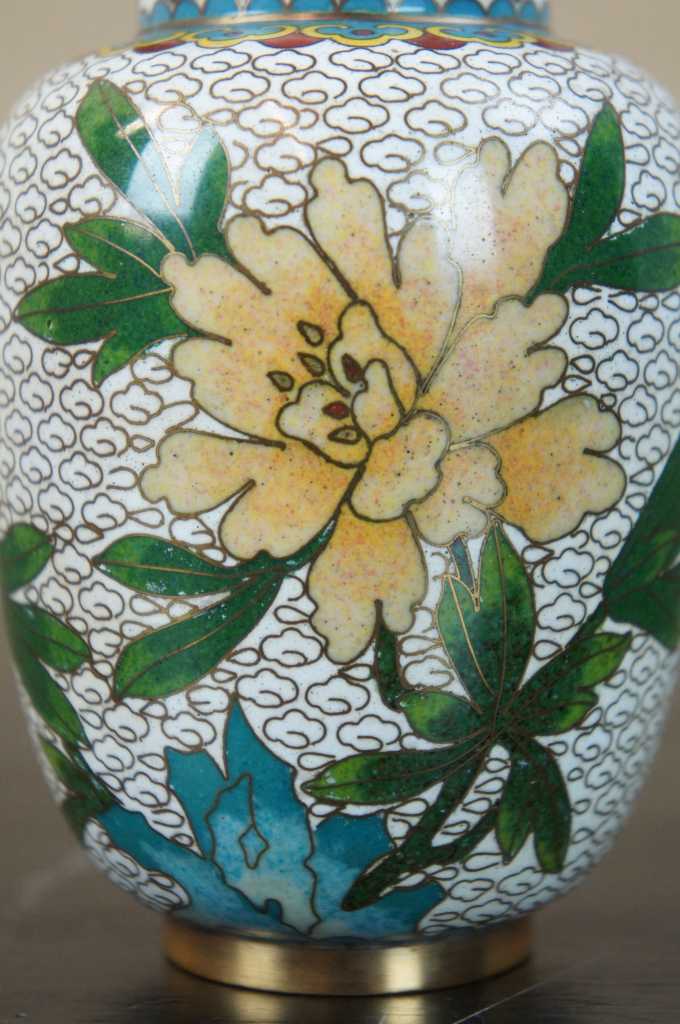 Nice white enamel lidded cloisonne urn; features field of white clouds, flowers and a bird.