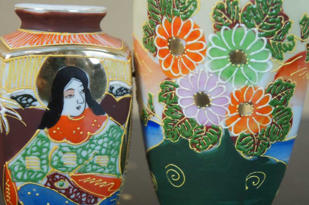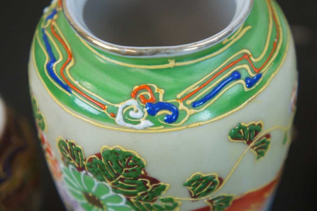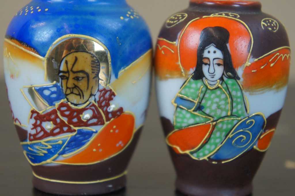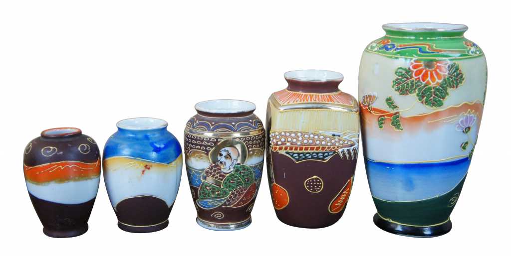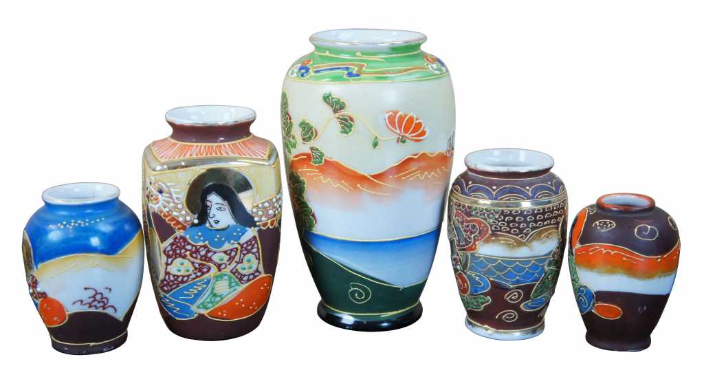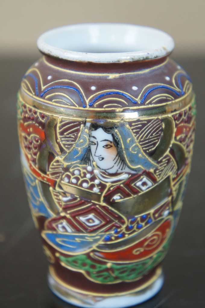 5 Japanese Satsuma Ware Mini Moriage Miniature Bud Vases God Goddesses Figures
