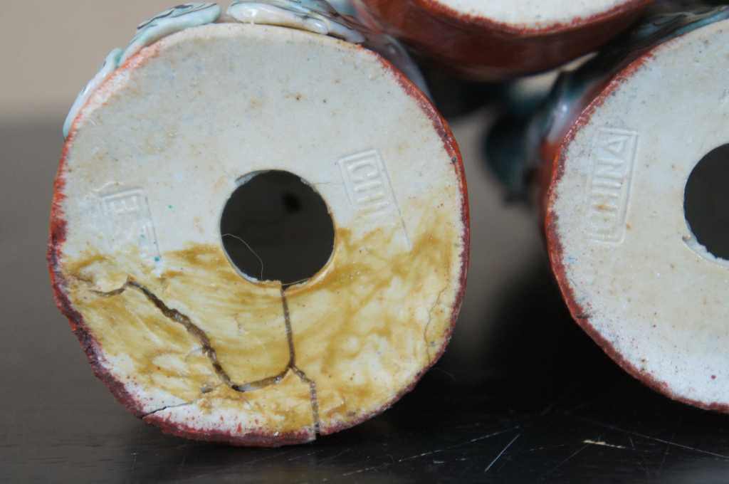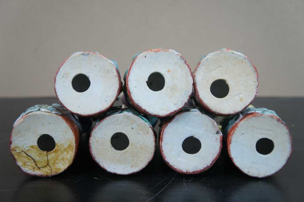 This beautiful lot of 7 are made from porcelain with intricate detail. 6 of the 7 have removable hands. Marked China along the base