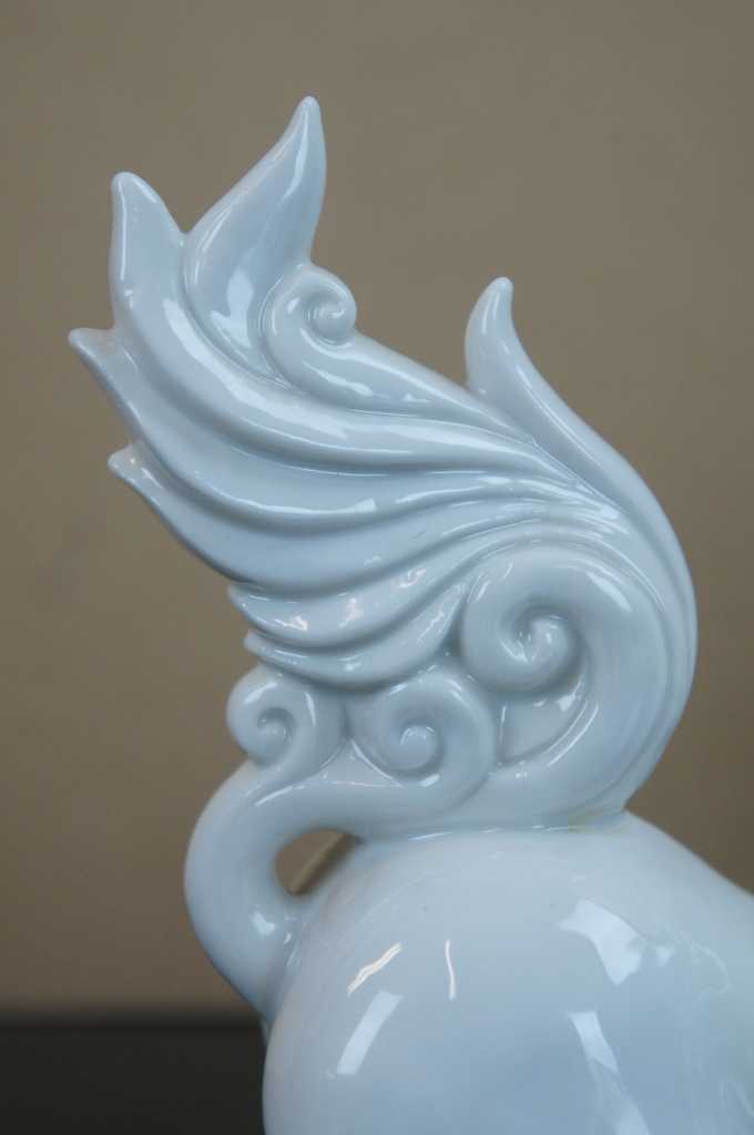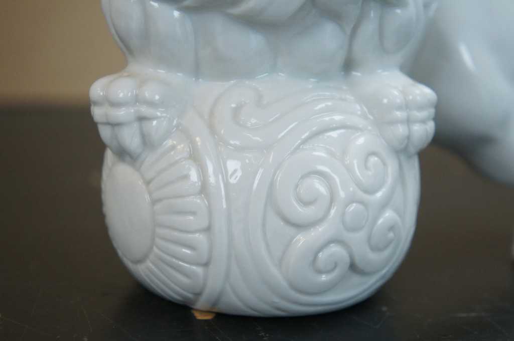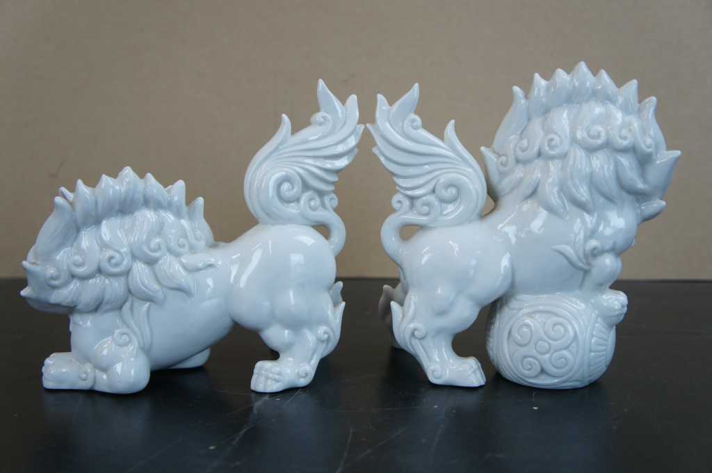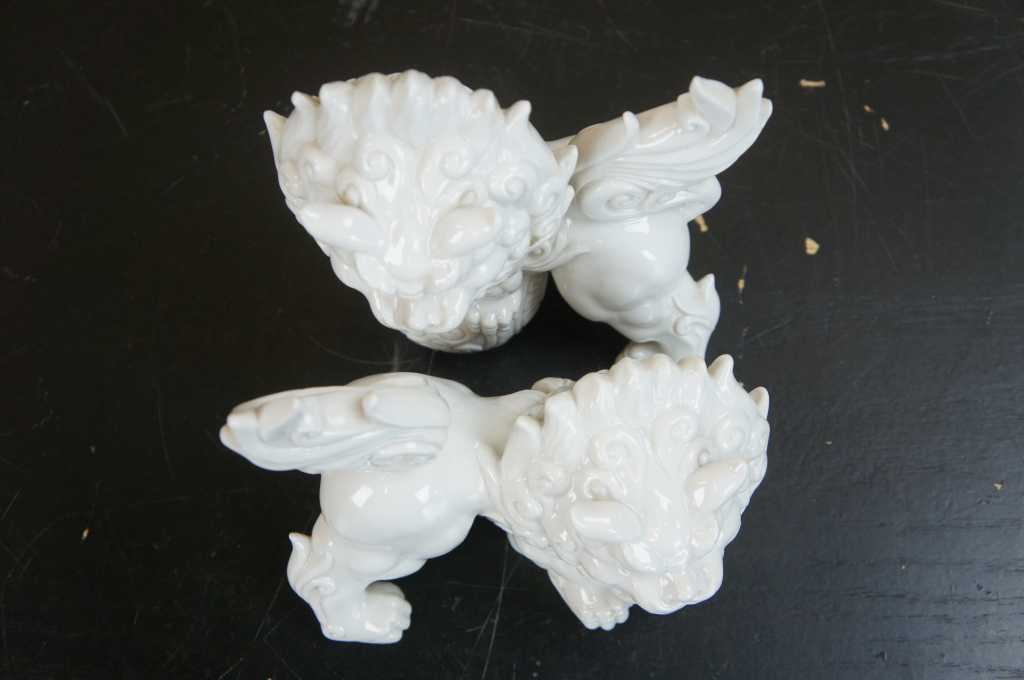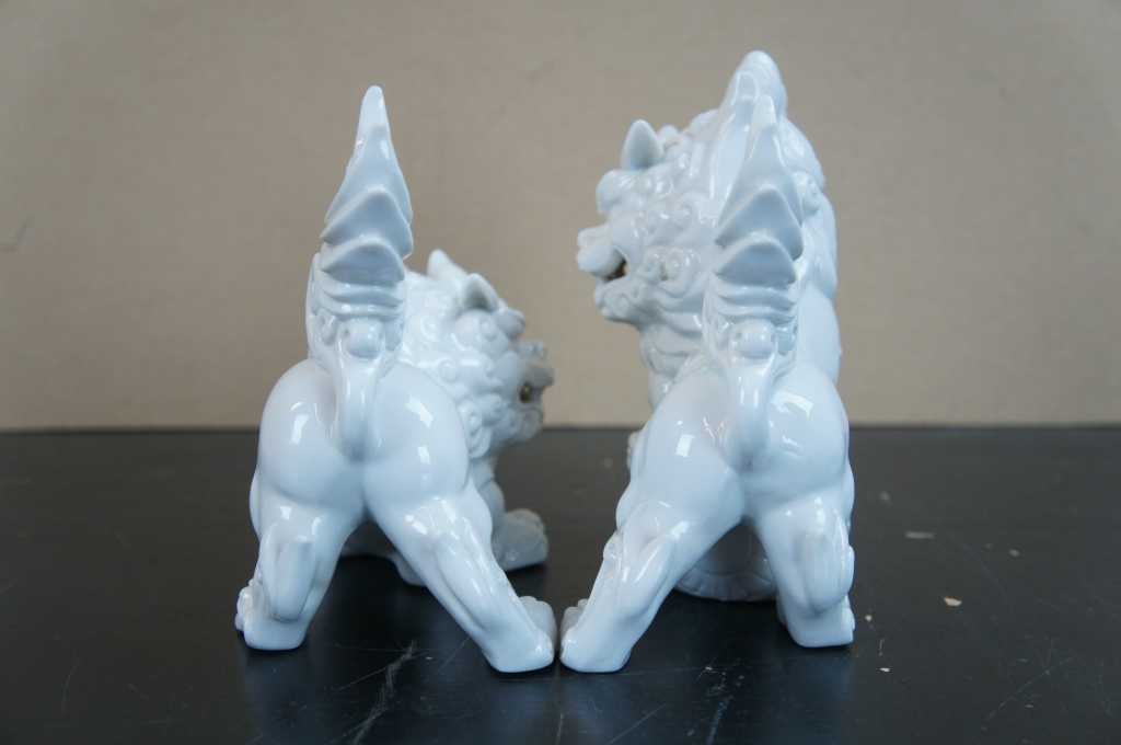 A fun pair of white porcelain foo dogs with winged tails.