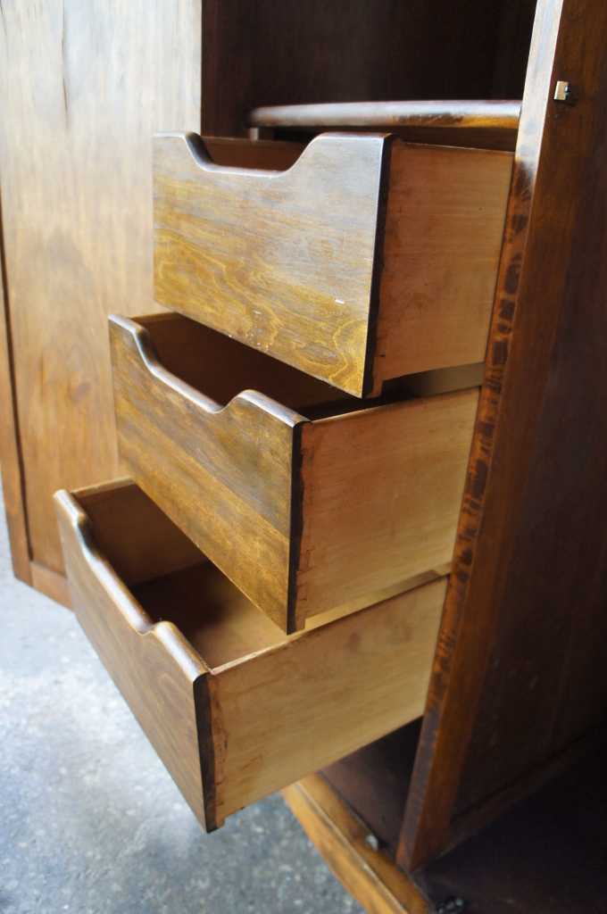 A lovely 1930s chifferobe. Made from walnut with a maple veneer inset along the front doors. Opens to drawers and shelves along the left and a hanging bar to the right.