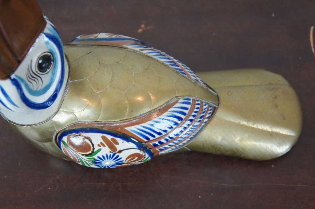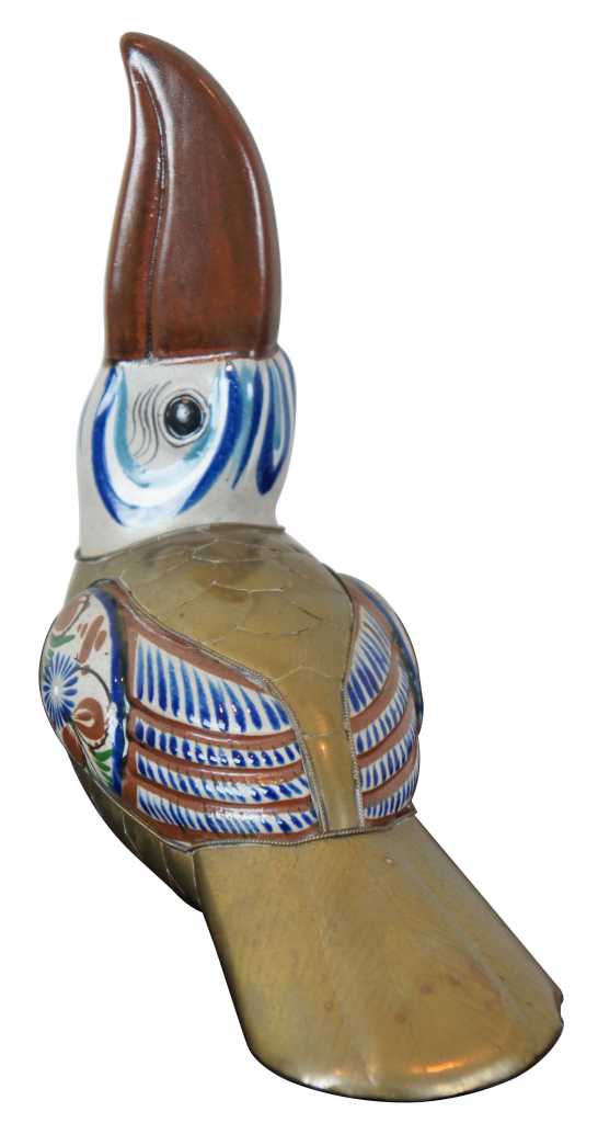 A lovely Sergio Bustamante inspired toucan sculpture. Made from brass with ceramic painted wings and face. Intricately detailed with layered wings and embossed accents along the tail. Perfect for display along a shelf or table surface.