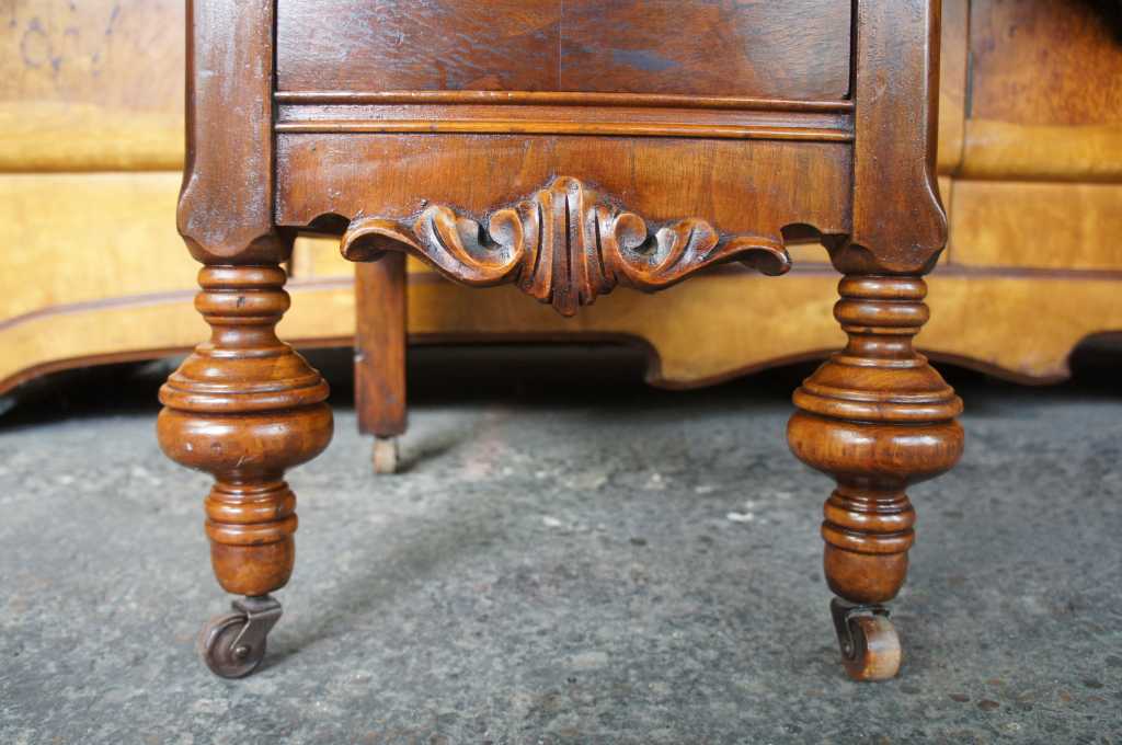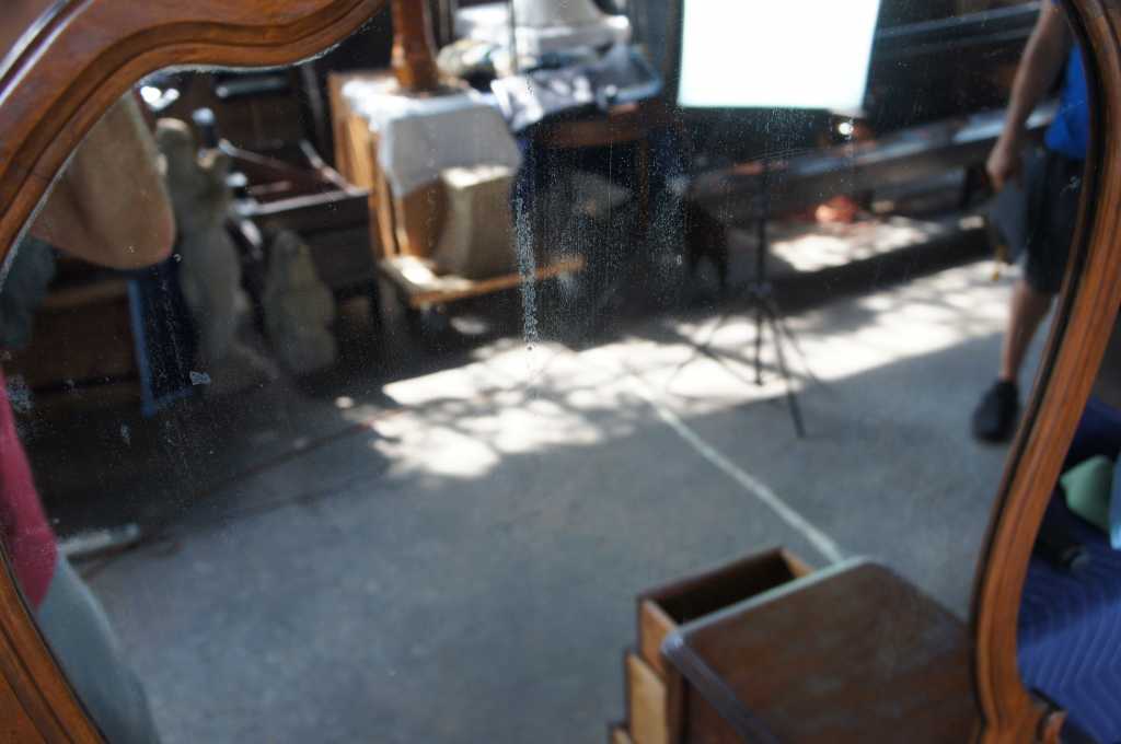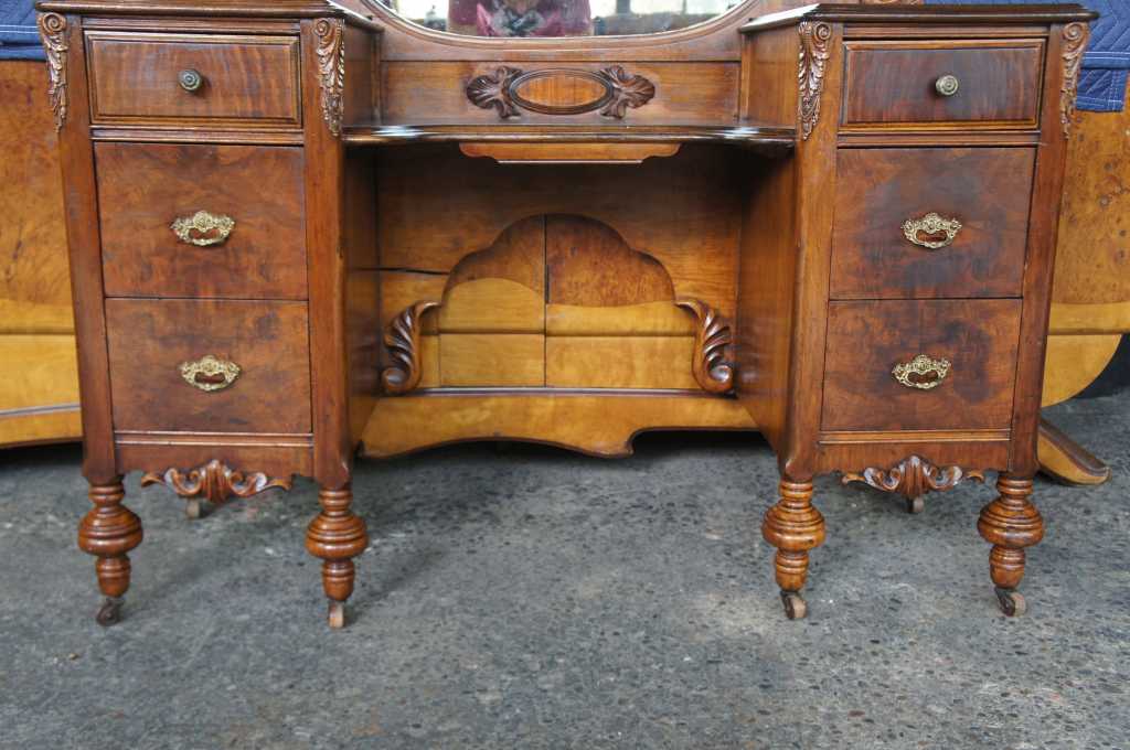 Good Antique Condition – Silver loss to mirror; Distressing from Use & Age. A split in the wood along the back of the knee-hole and right side of mirror frame