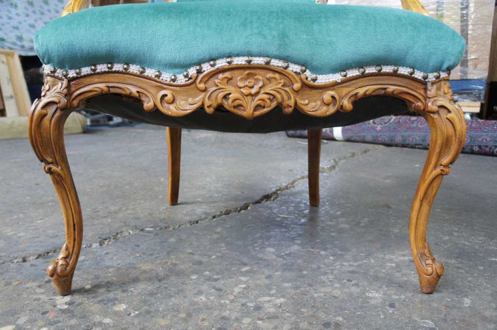 This gorgeous example is made from walnut with heavily carved cabriole legs and lower wooden apron. Upholstered in turquoise with cording and nail head trim. A nice desk office or accent piece.