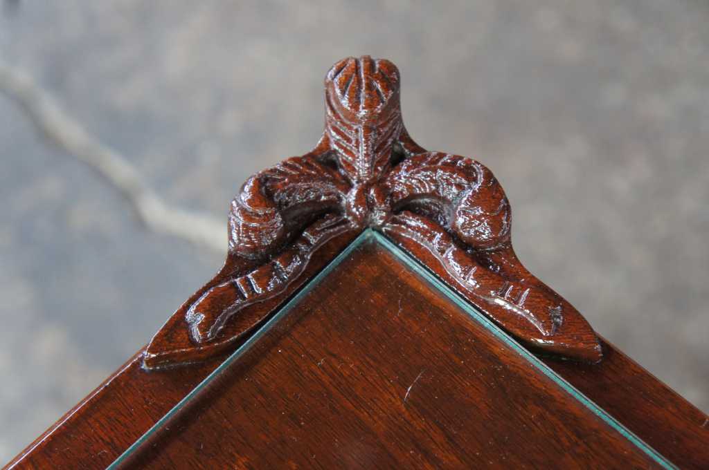 Antique french or baroque revival side table with glass top. Made from mahogany with intricate fleur-de-lis carvings along the legs and top. Features trophy and diamond designs along the apron and acanthus scrolled feet.