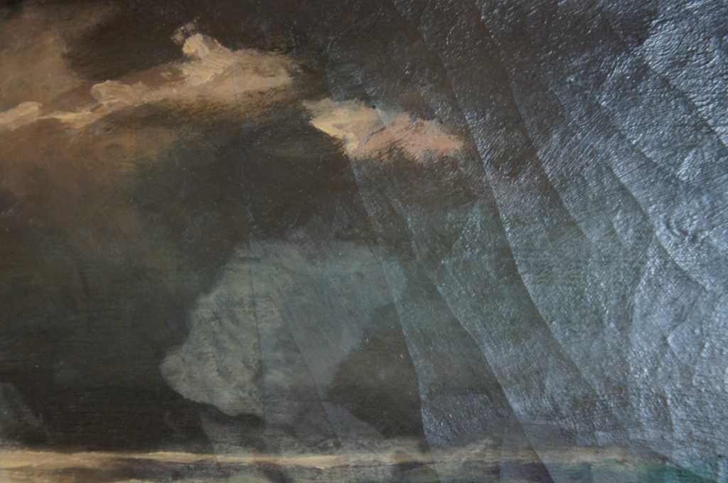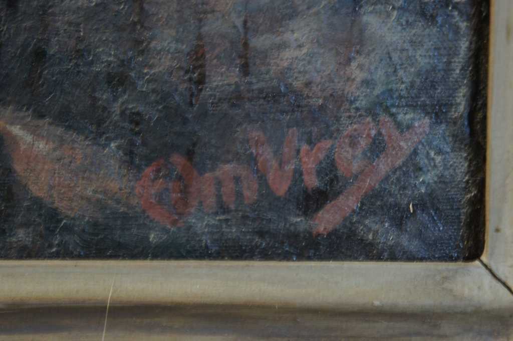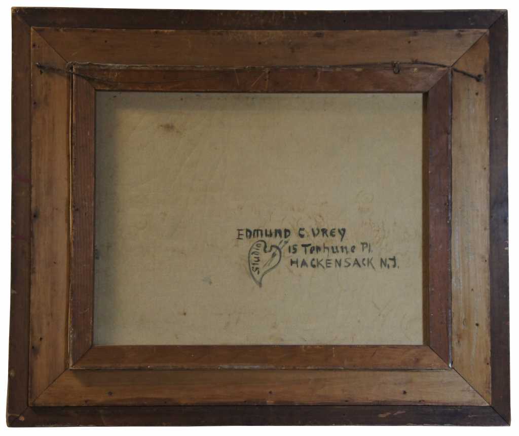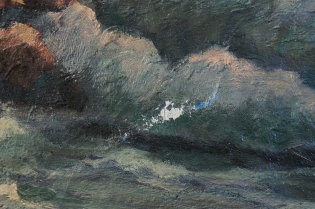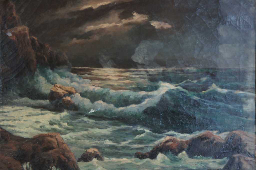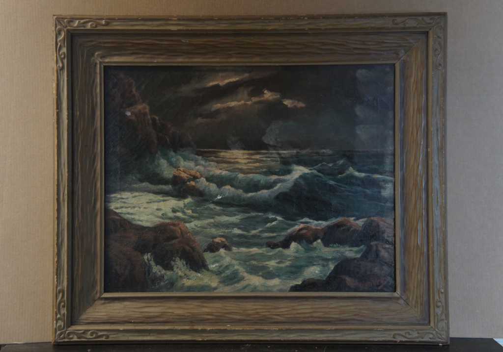 Signed Seascape Painting by Edmund Very of New Jersey. Oil depcits an ocean landscape with waves crashing against the cliffside rocks, sunlight wanes distant peaking throught the clouds. Edmund Very was a painter from Hackensack New Jersey, early 20th century