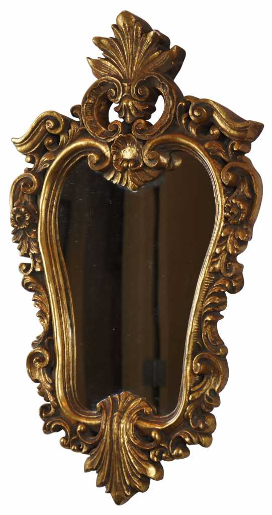 Baroque inspired wall hanging mirror. Perfect for an entryway, hall or bathroom. Finished in antique gold
