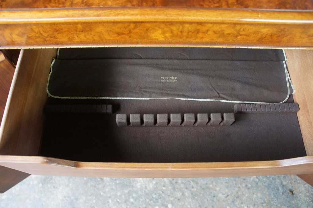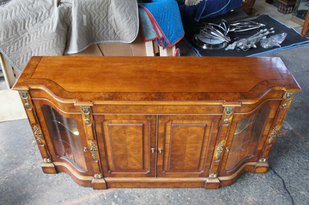 Henredon "Grand Provenance" sideboard & mirror, model #5100-21. Made from mahogany with banded and burled trim. Features center doors concealing slide out silverware drawer and open storage, flanked by two glass contoured side doors with two glass shelves. Neoclassical inspired with ball and dart carving, brass mounts, cross banding and a plinth base.
