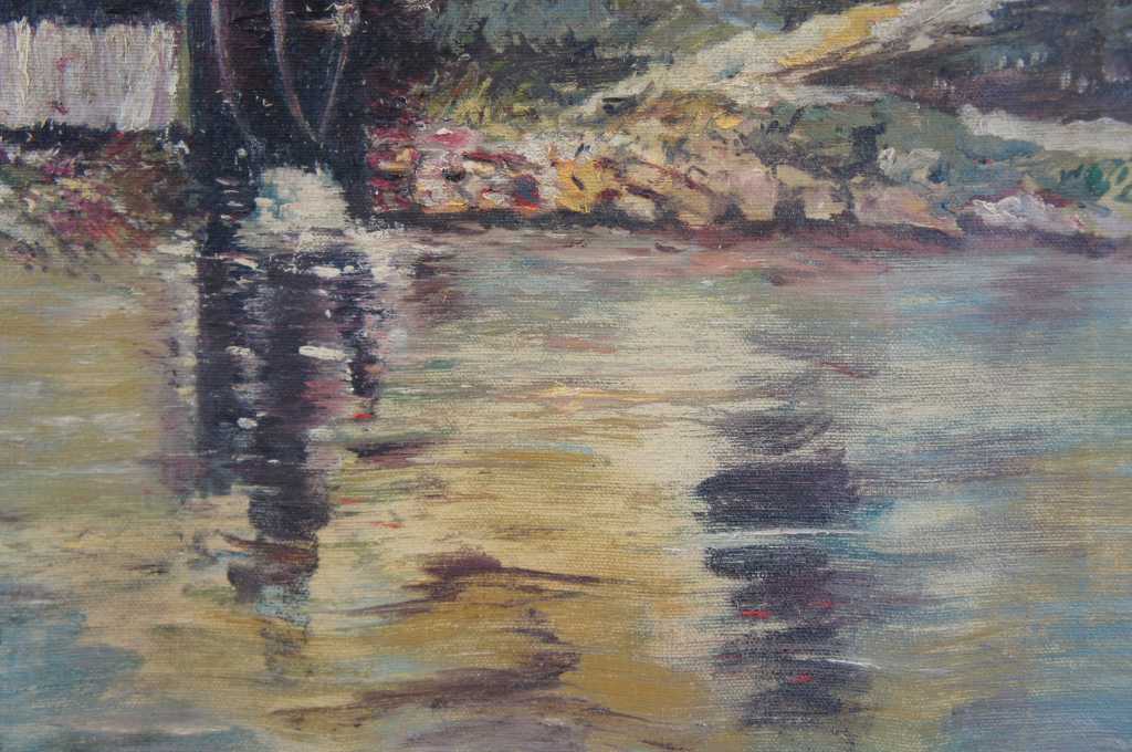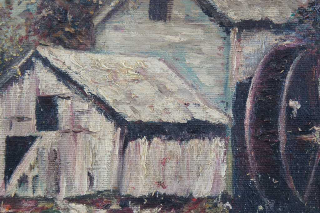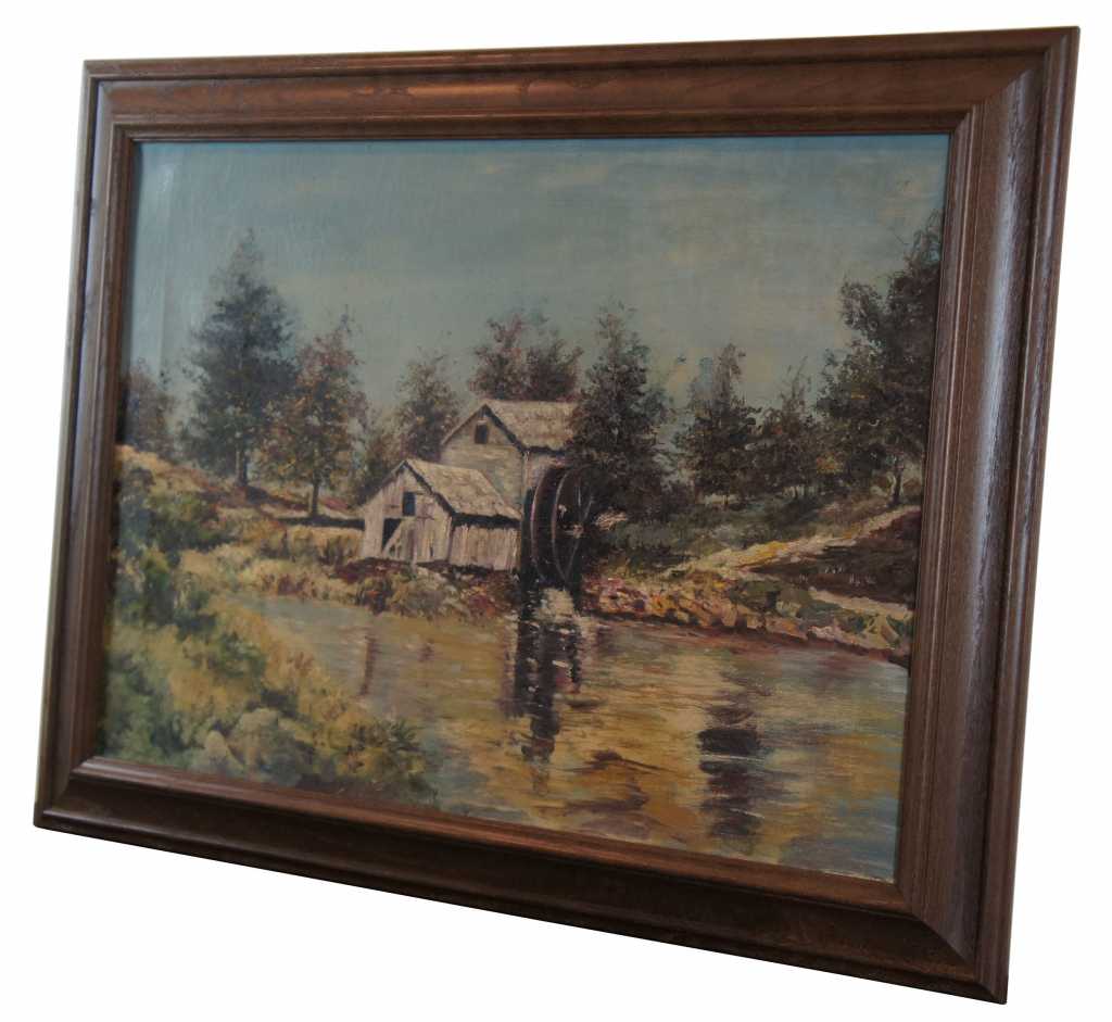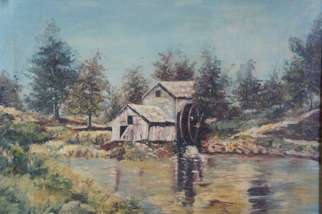 Neat countryside landscape showing a barn and watermill reflecting against the water