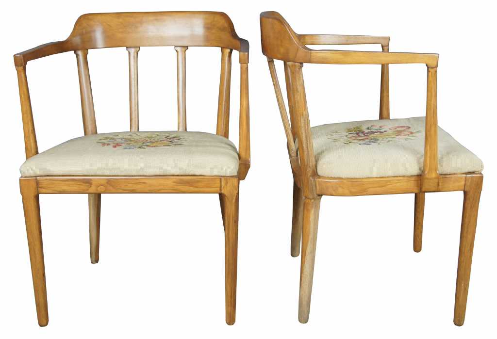 Made from walnut with a barreled slat back and embroidered seat