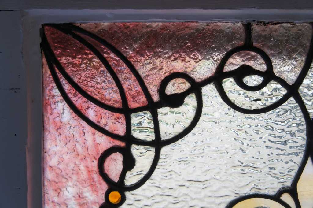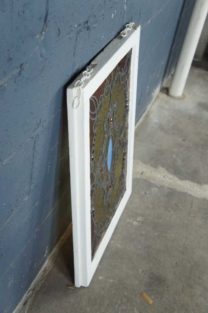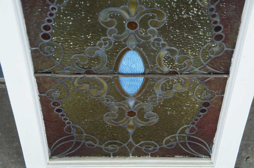 Up for consideration is a stunning stained glass window. Salvaged from a building in Cincinnati Ohio. Circa 1850-70s. Features an amazing Fleur de lis design beaded with rose, amber and blue glass. A true work of craftsmanship.