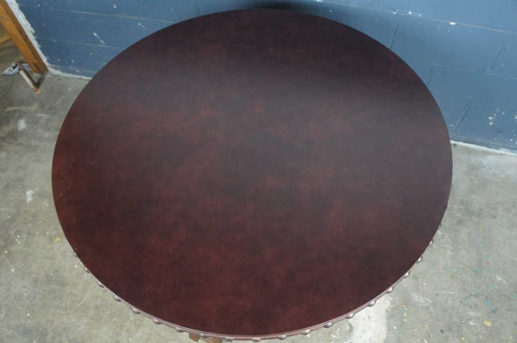 Features Mission staples like keyed mortise and tenon joinery and a thick 1 11/16" oak top with aged brown leather and brass nail head trim.