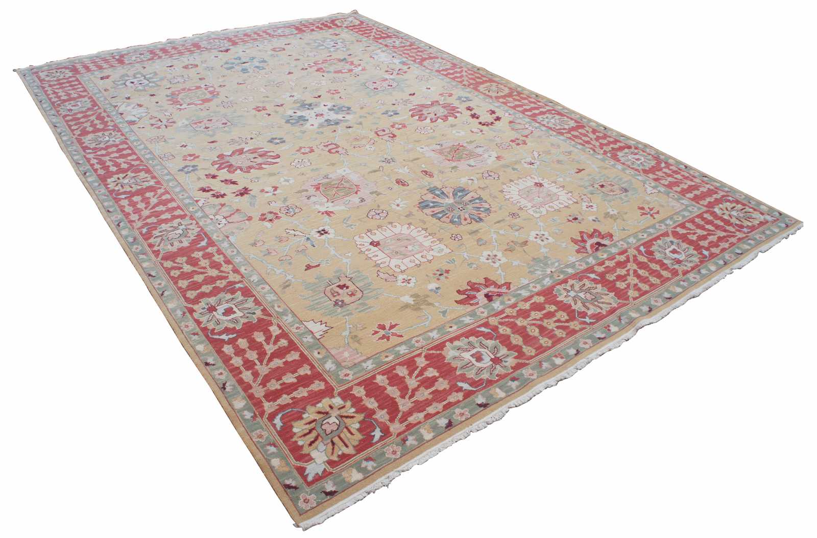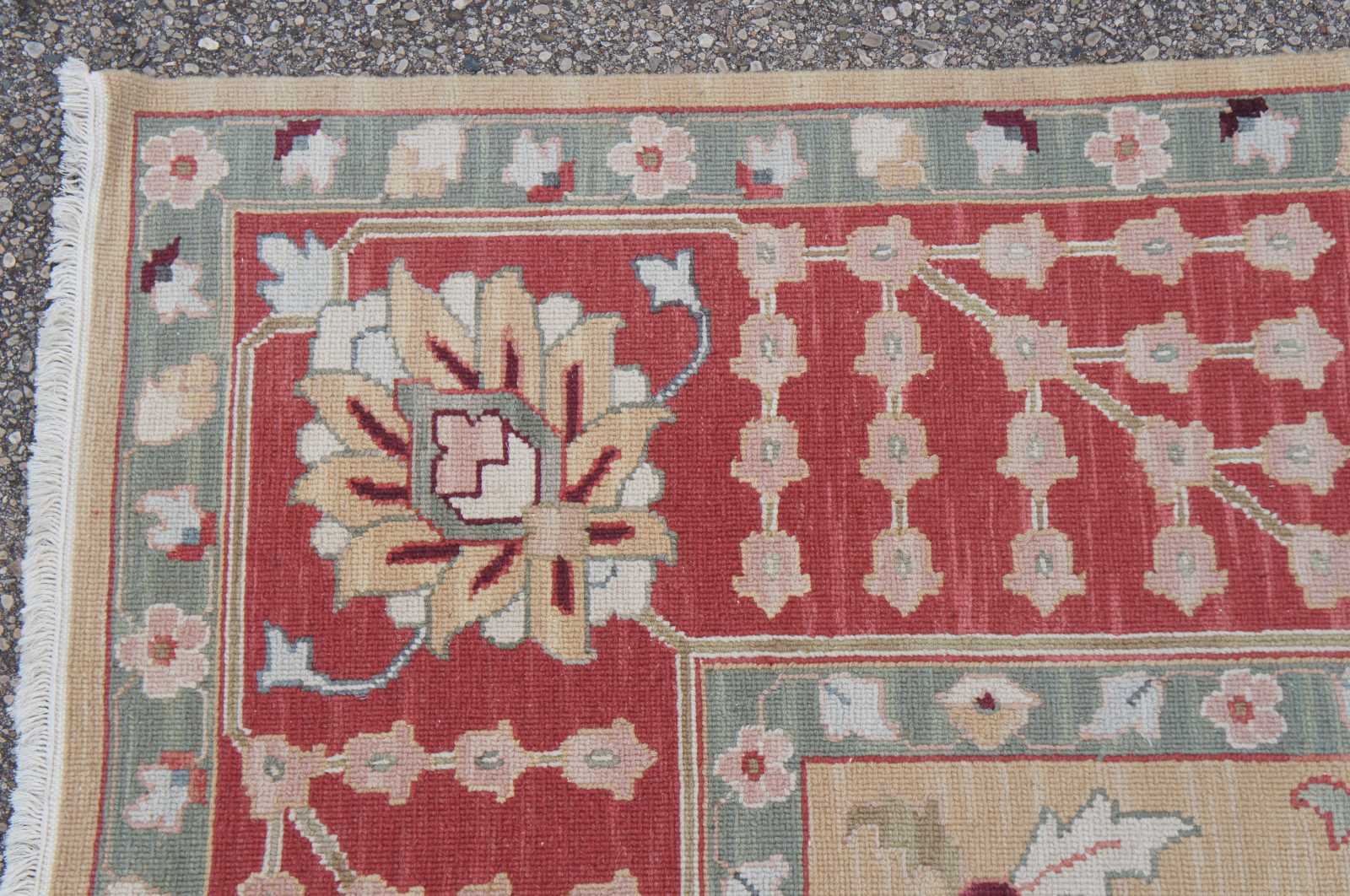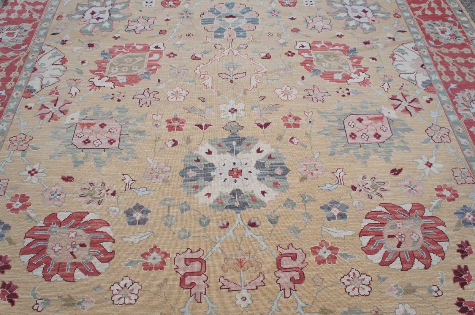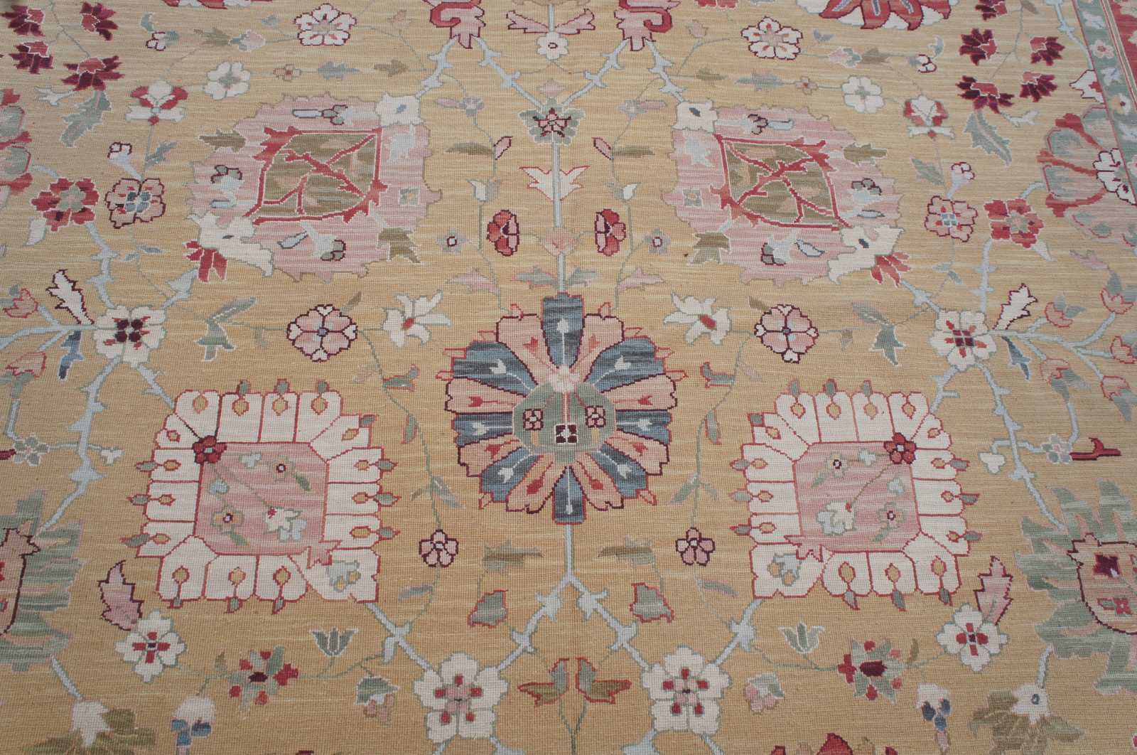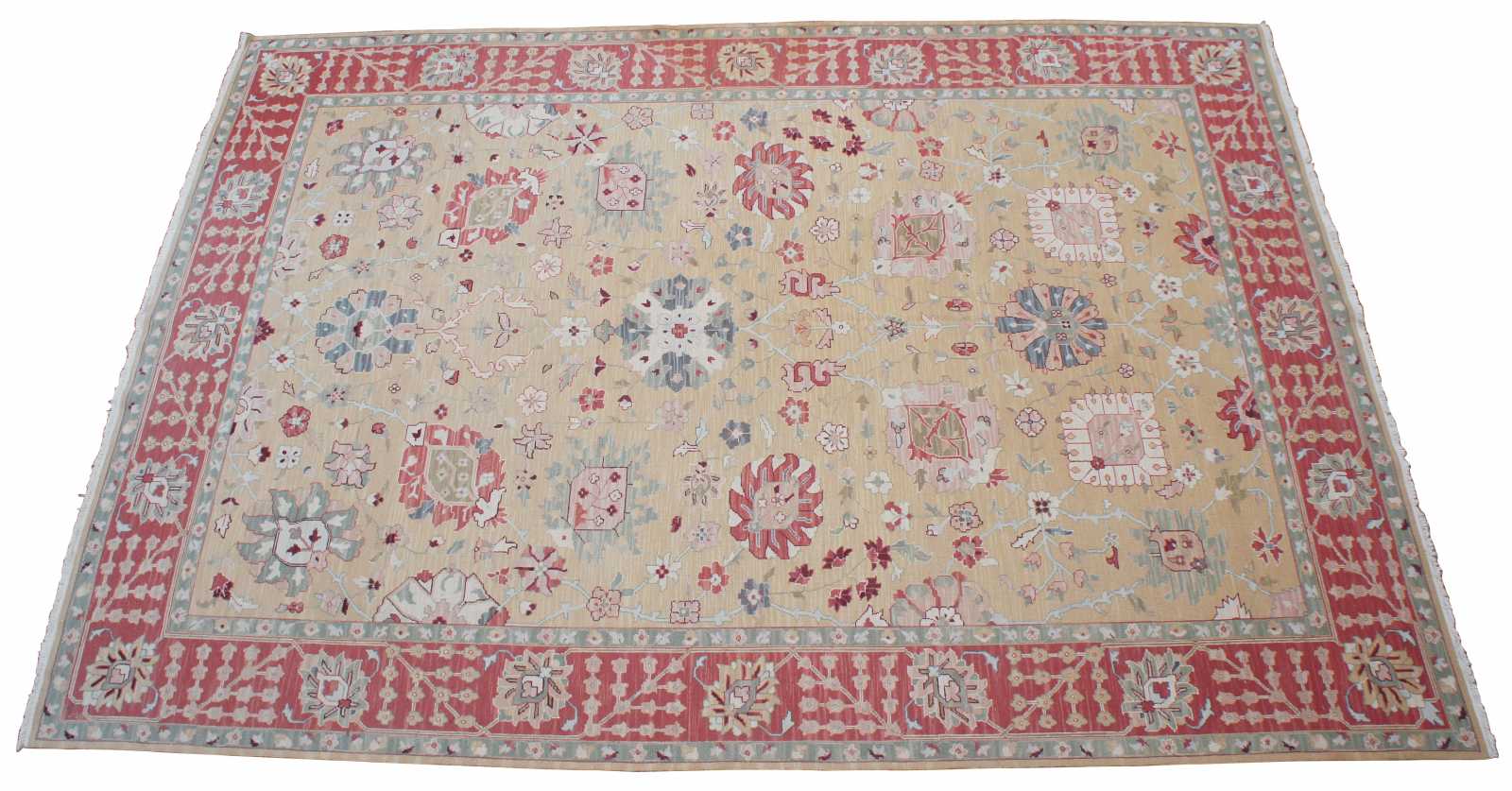 Dreamy, flowerlike shapes arranged in geometric harmony present an exceptional design for the discerning collector. The glowing golden ground is highlighted by delicate details in cinnabar, peach and bay leaf. Large flowerheads interspersed with tiny blossoms create beautiful interplay. The border is equally refined. A hypnotically appealing rug.