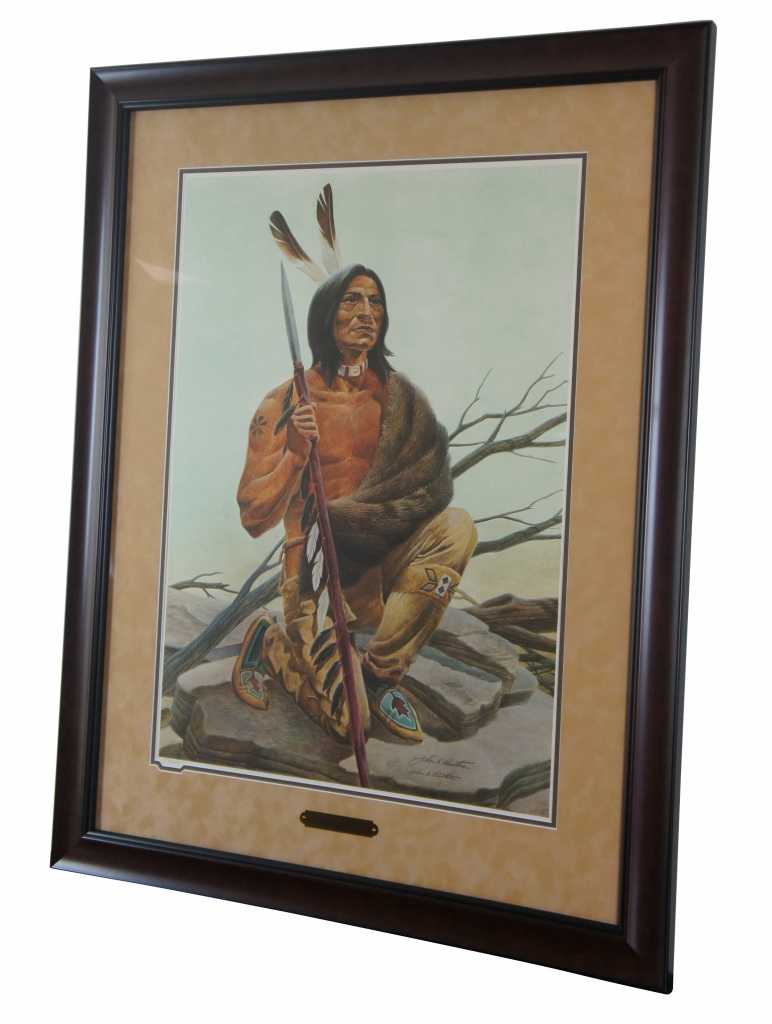 A pencil-signed John Ruthven lithograph, numbered 509/1000, ‘Miami Indian’, from an original painting commissioned for the Murstein Alumni Center at Miami University. The work depicts a full image of a kneeling member of the Wea branch of the Miami Tribe. The Miami Indian is modeled after Little Turtle, the chief of the Miami Tribe who counseled peace before the Battle of Fallen Timbers. The lithograph is pencil signed by the artist to the lower right side and double mattedis matted with a mahogany finished frame. On the back of the work is infomration related to Ruthven's commission.