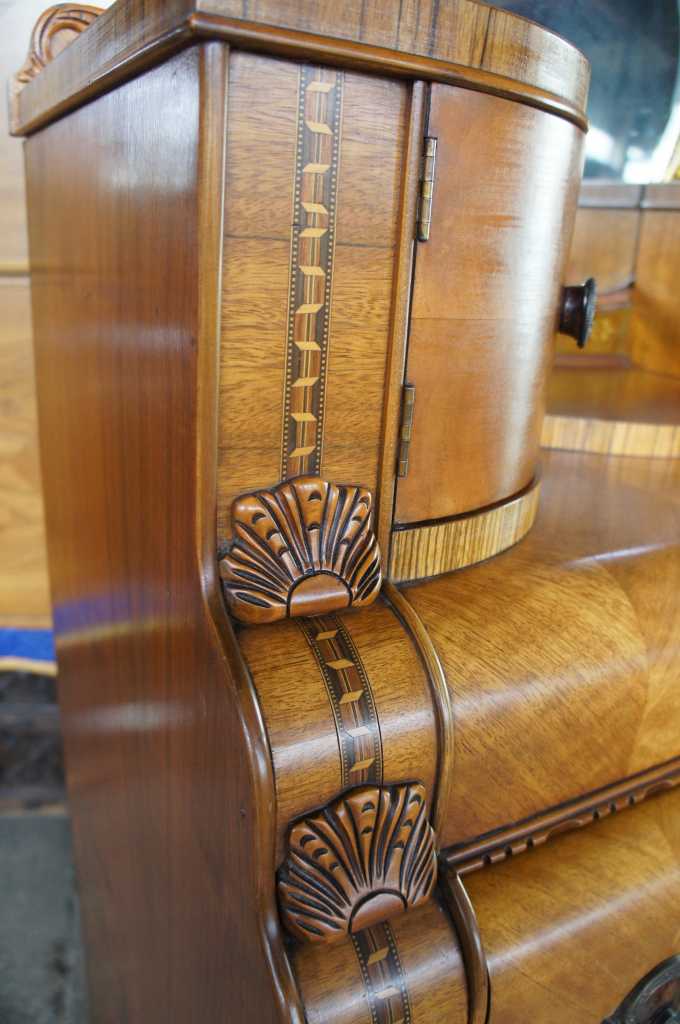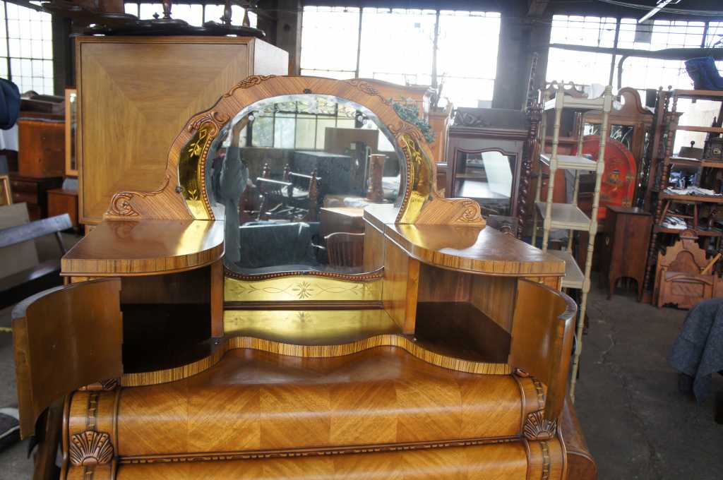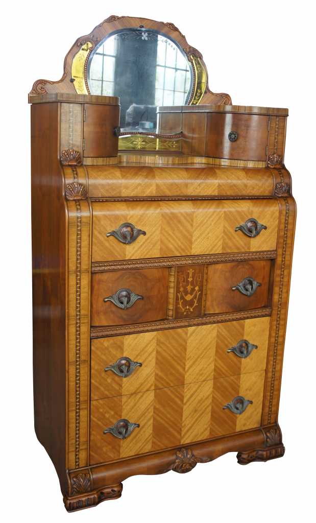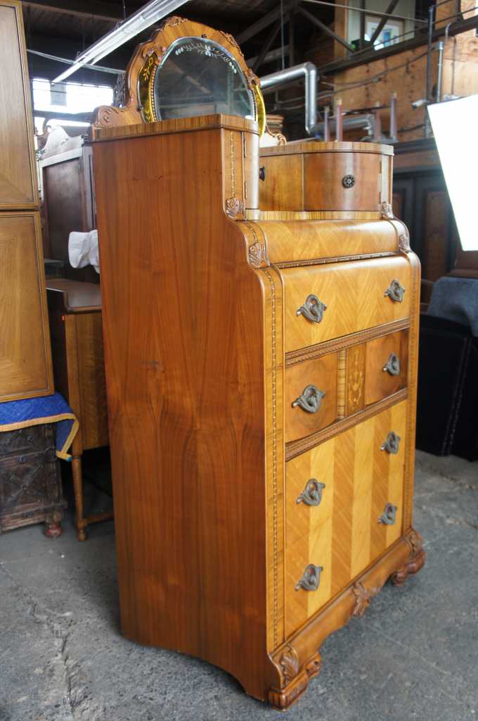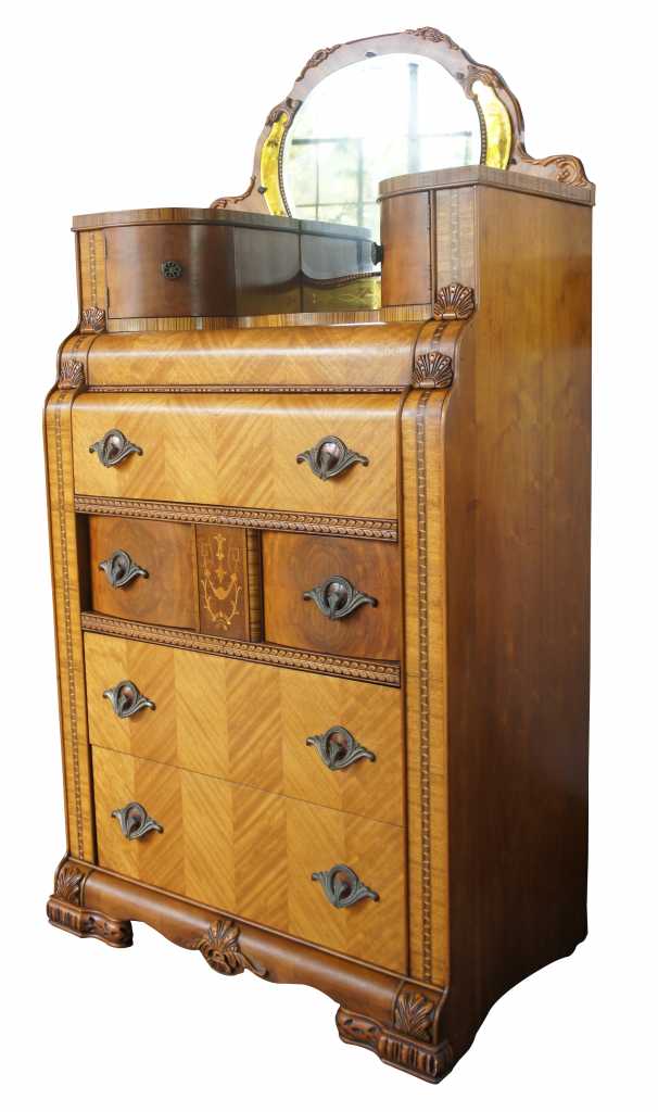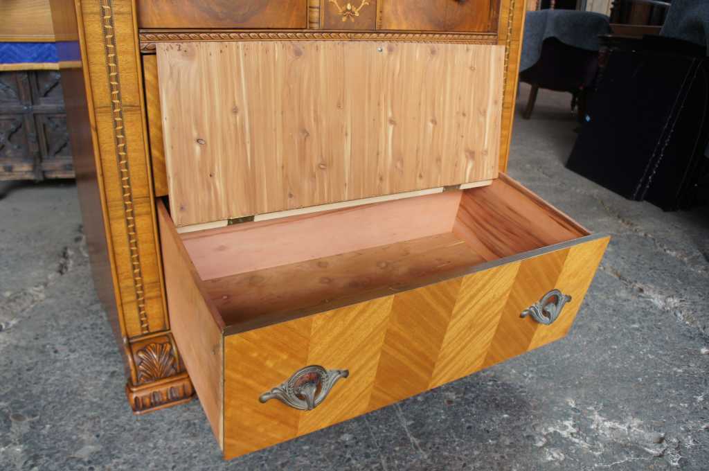 Leo Jiranek 1930s Art tall dresser with mirror. Part of a three piece set. Constructed from oak with carved accents, matchbook veneered front and top, burlwood panels and fruitwood inlays. Features a four panel rounded and beveled mirror with smoked glass panels and floral engravings. Includes two upper cabinet doors and five dovetailed drawers with brass hardware and bakelite at the center. The lower most drawer is cedar lined to keep your winter wear safe.